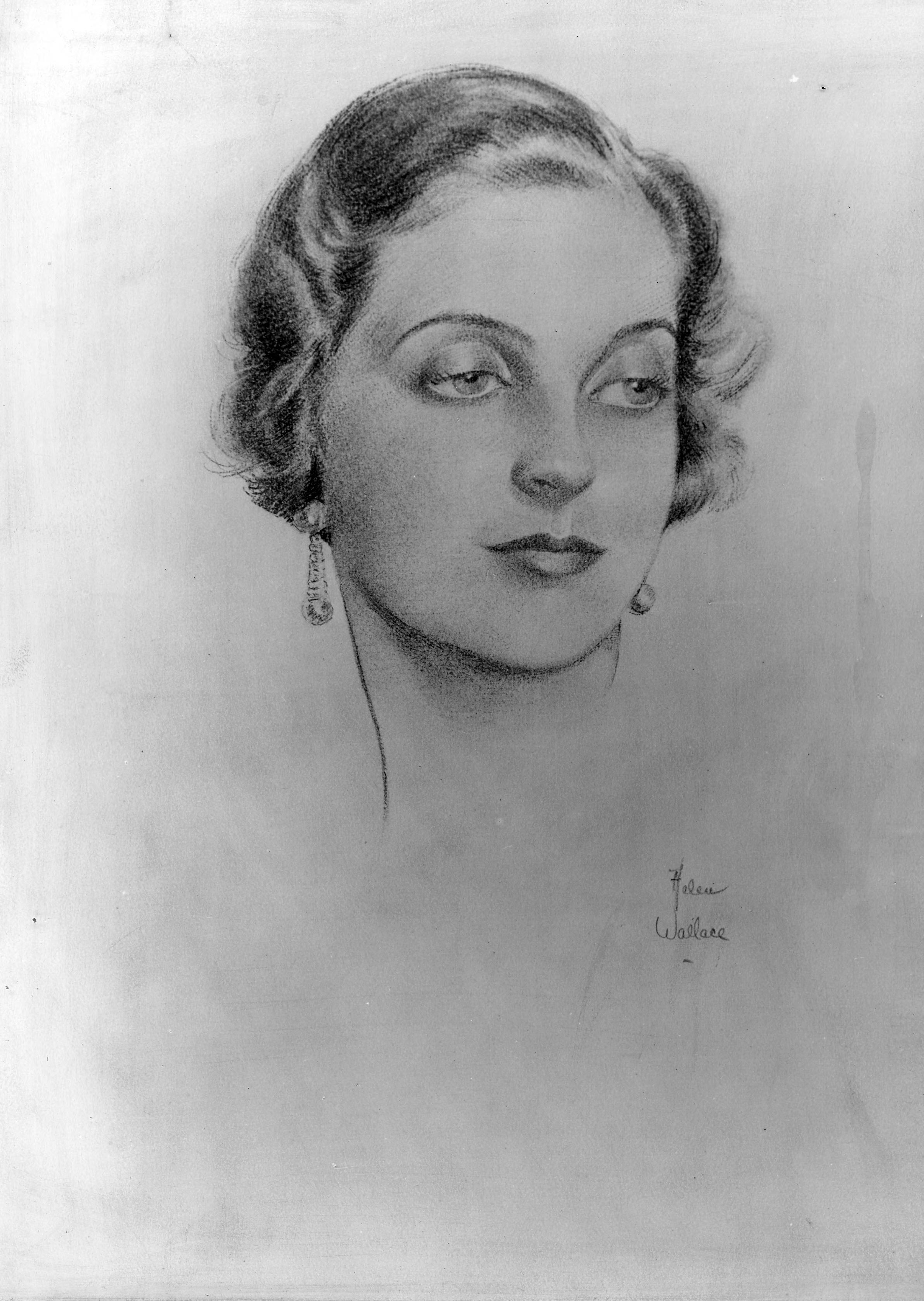 Sketch of a young woman with blond hair and dangling earrings, eyes downcast. The original has a finished appearance, not just a preliminary sketch.