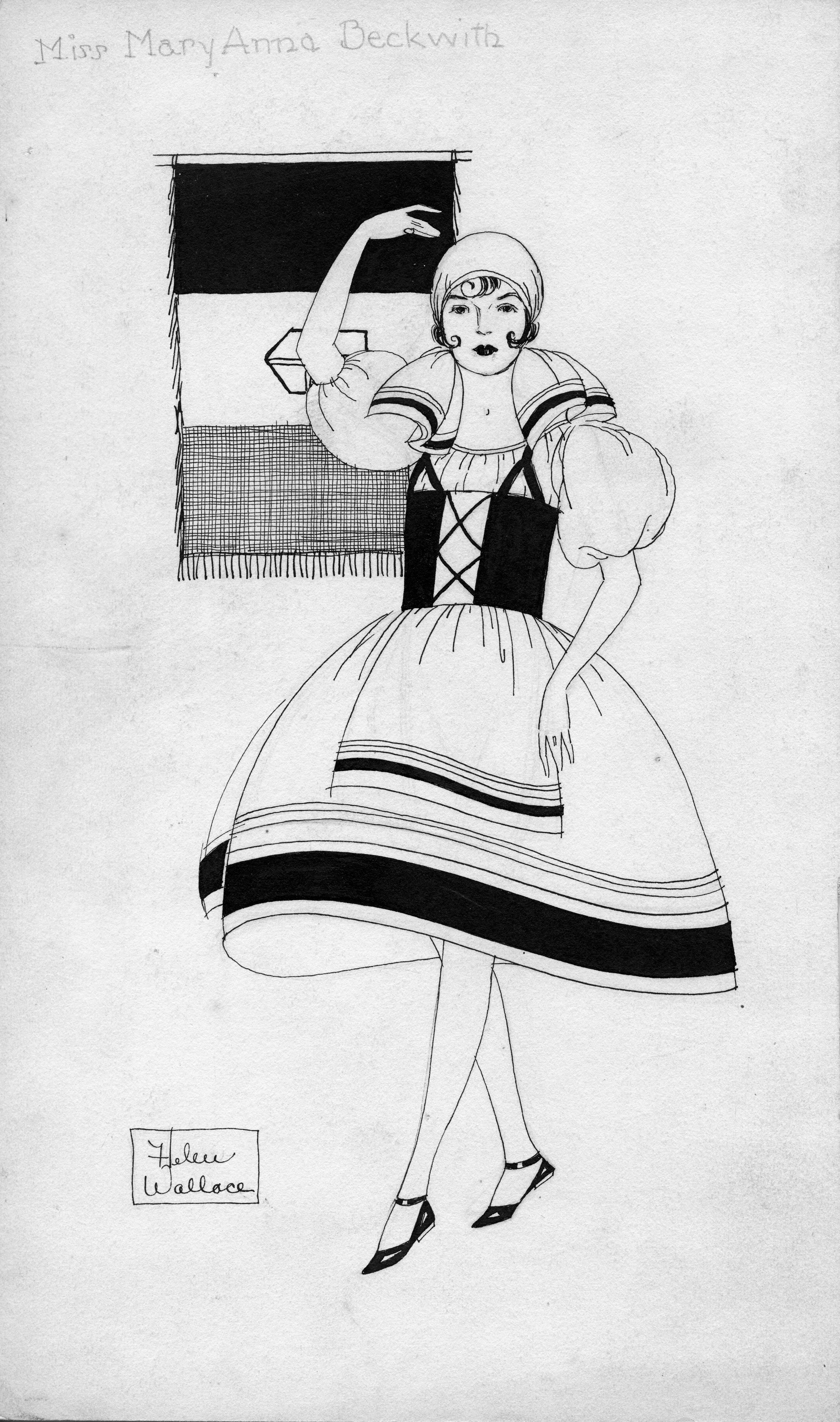 Pen drawing of Miss Mary Anne Beckwith, wearing a dirndl dress and posing as if she's dancing. The flag behind her cannot be identified.