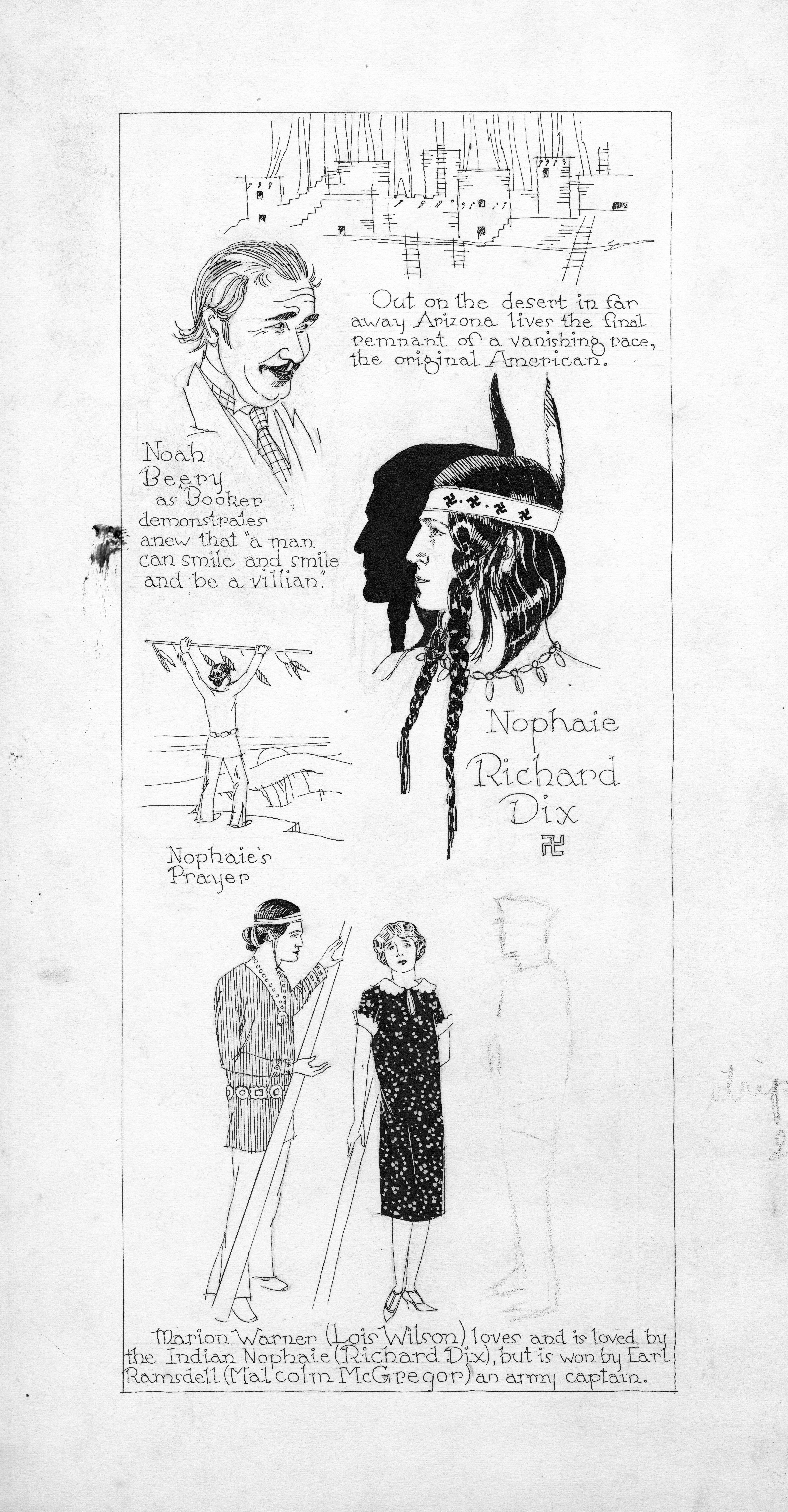 Pen sketches for The Vanishing American starring Noah Beery, Richard Dix, Lois Wilson, and Malcolm McGregor. This was a Famous Players-Lasky Corporation silent production in 1926. The novel on which this was based was written by Zane Grey.