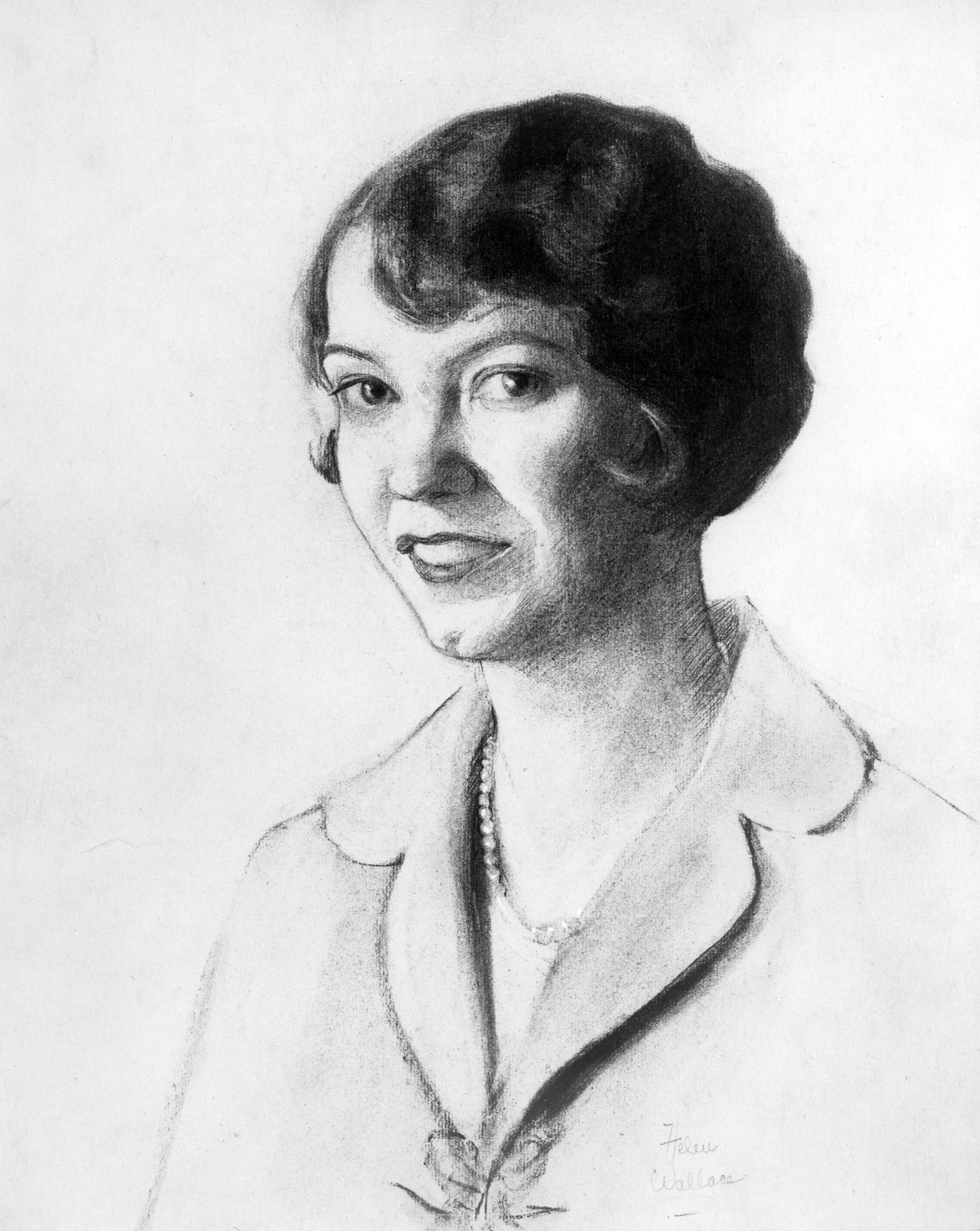 Pencil drawing of a fashionable young woman, a pearl necklace and what might be Marcel waves in her hair. Her curved collar has notches and appears to end in a bow. Marcelling was popular in the 1920s, when these portraits were done, and the artist is known to have done portraits of socialites.