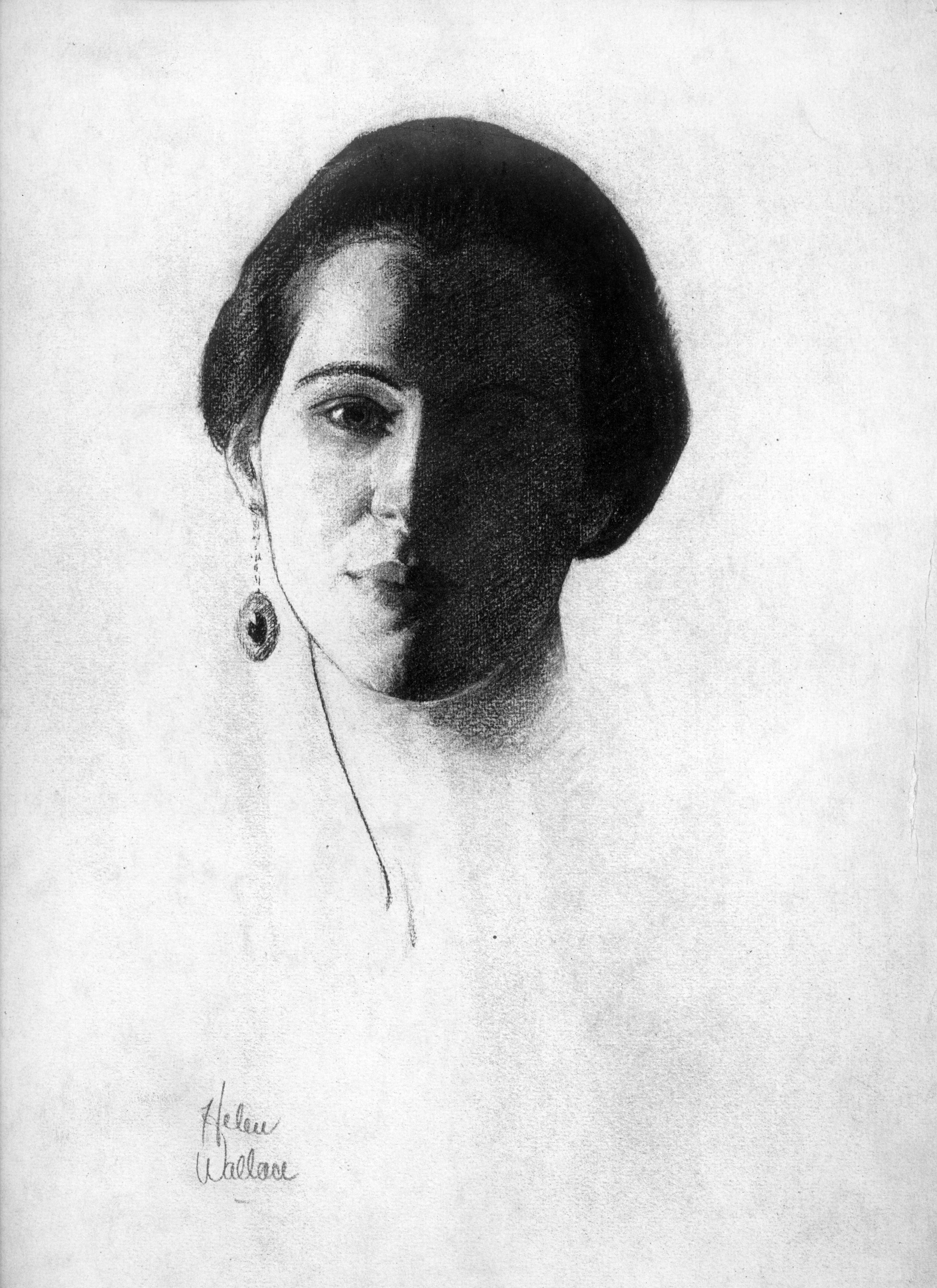 Pencil drawing, half in shadow, of a young woman with a long ornate earring with possibly a gemstone in the center
