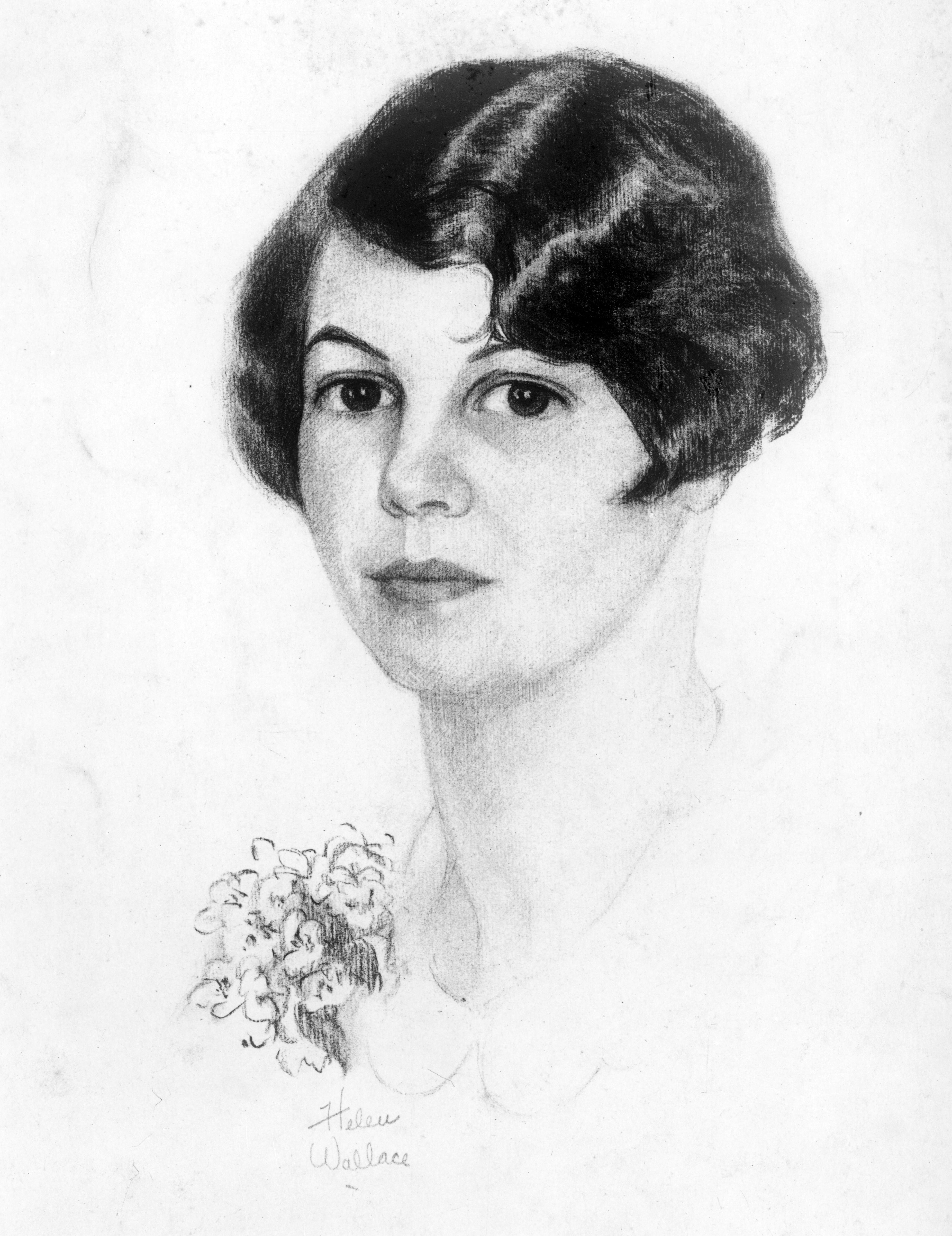 Pencil drawing of a fashionable young woman, with what might be Marcel waves in her hair. Her top has a Peter Pan collar and it looks as though flowers were drawn by her shoulder. Marcelling was popular in the 1920s, when these portraits were done, and the artist is known to have done portraits of socialites.