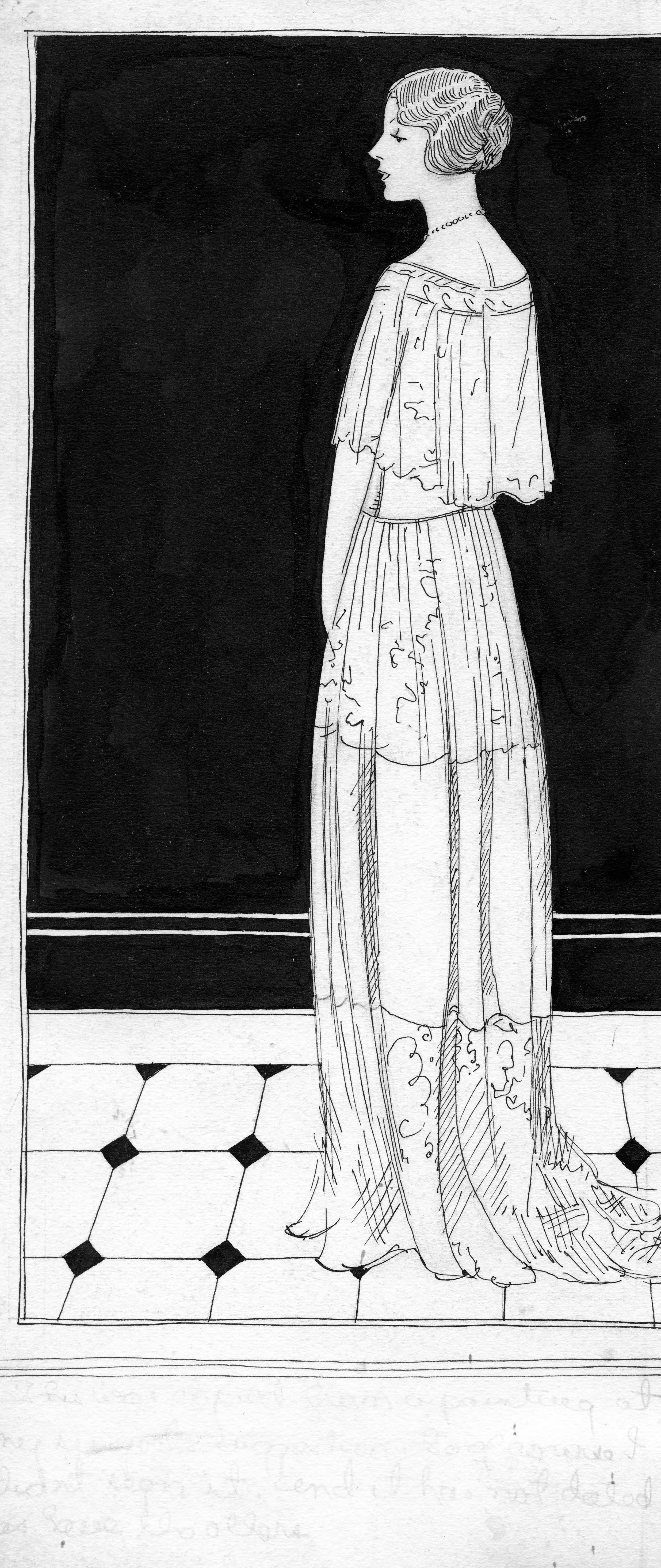 Pen drawing of an unidentified woman with a long dress and a cape-style bodice