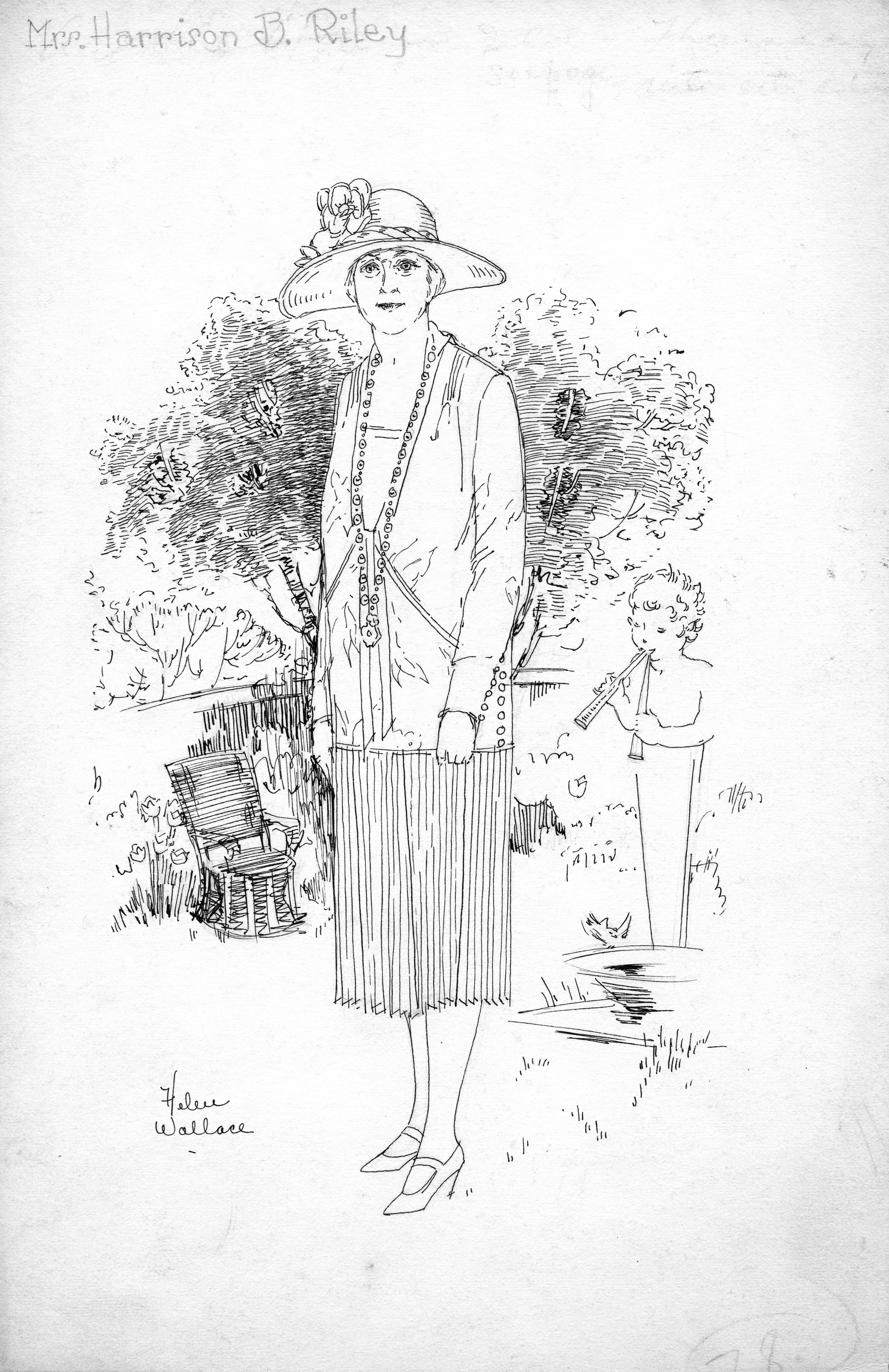 Pen drawing of an older woman, standing in a garden. She is identified as Mrs. Harrison B. Riley. A possible further identification is Alice Cushing Donaldson (1867-1955) who married Harrison Barnett Riley (1862-1944) in the late 1880s.