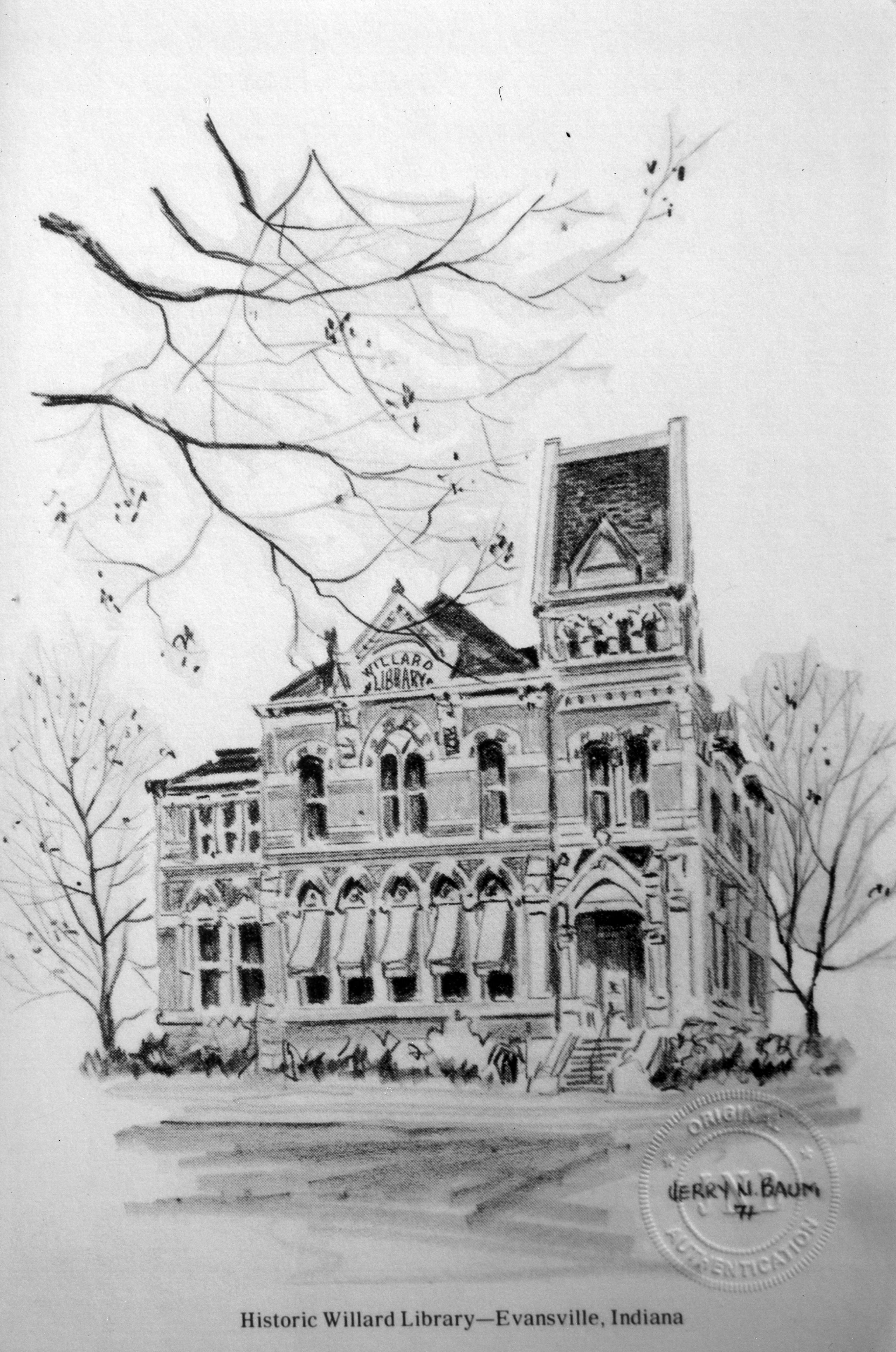 Jerry Baum sketch of Willard Library. Willard Library at 21 First Ave. was a gift to the city by prominent businessman Willard Carpenter. The Gothic revival style building was begun in 1876, but construction ceased in 1877 due to an economic downturn and did not resume again until 1882. The library opened in 1885. Carpenter did not live to see its completion, dying in 1883. Although it is not part of the Evansville Vanderburgh Public Library system, Willard Library is Indiana's oldest public library.