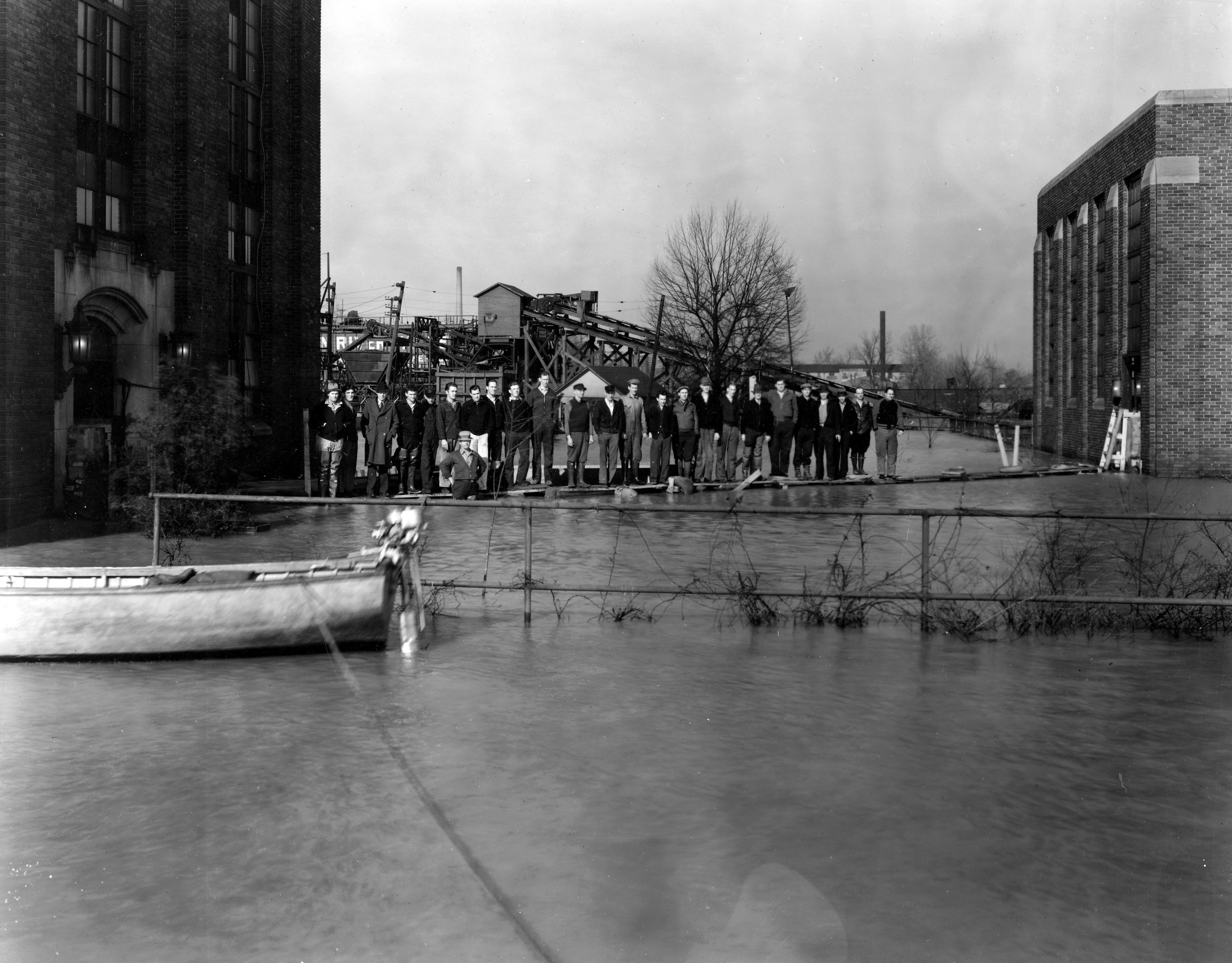 Southern Indiana Gas and Electric Co. (SIGECO) power plant at 2501 Broadway by flood water. Here the workers that keep the plant operational standing outside on a catwalk. Noel Baum, the originator of this collection, is far right. The rains started in December and they kept coming and they kept coming and they kept coming until, by the middle of January, the Ohio was above flood stage virtually everywhere.� The rain combined with sleet and snow to create a hazardous scene all along the Ohio, from Pittsburgh to Cairo, Illinois. Water covered 70 percent of Louisville, 90 percent of Jeffersonville and most of New Albany. The flood killed 385 people in all, leaving 1 million homeless and causing $250 million in property damage ($3.4 billion today), according to one National Weather Service estimate. Evansville residents had dealt with floods before, in 1907, 1913, 1927 and 1933. But when they awakened January 10, 1937 to a thick layer of ice on top of already soaked ground, they suspected this one might be worse. A week later, the heaviest rains fell, submerging more than half the city. On January 24, martial law was declared. On Jan. 31, the river crested at 54.74 feet. [19 feet above flood stage] Amazingly, though Evansville was among the hardest hit, no one drowned in Vanderburgh County. (http://www.greensburgdailynews.com/opinion/columns/flood-put-evansville-under-water/article_28cff413-249c-5378-aa3e-9a76a9a0b108.html) As for the power plant shown here, Southern Indiana Gas & Electric Co. refused to be licked by a merciless river so Evansville was the only flooded-out city from Pittsburgh to Cairo to save its power supply. Several heroic workers were sealed 50 feet down in a shaft surrounded by the floodwater to man a vital pumping station. A city plunged into darkness would have crippled relief efforts and invited panic. (http://www.courierpress.com/story/news/local/2017/01/28/80-years-ago-river-flood-consumed-evansville/97039764/)