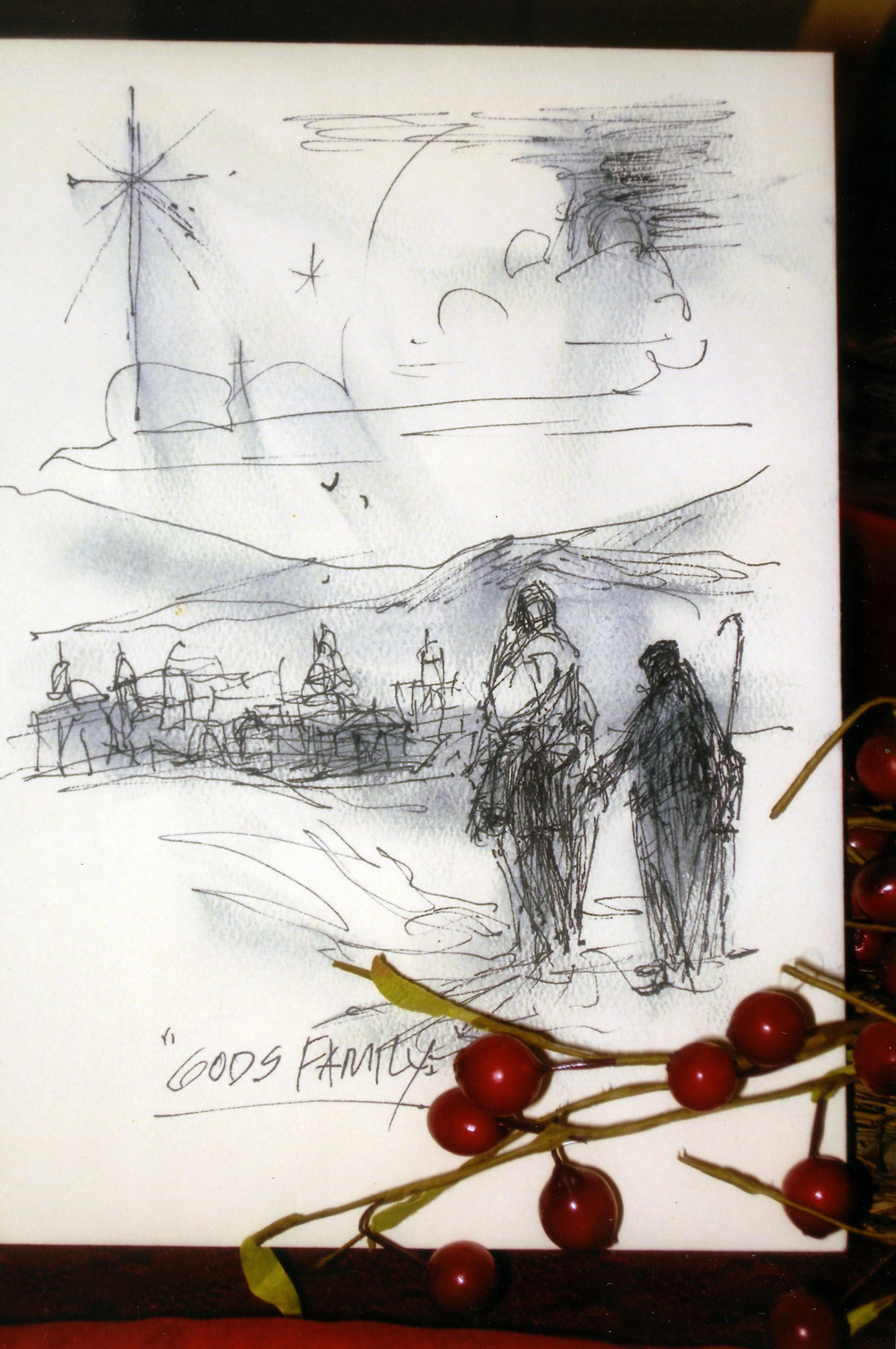 Jerry Baum sketch titled Gods Family. It appears to be a depiction of Mary and Joseph. There are berries laid atop the sketch.