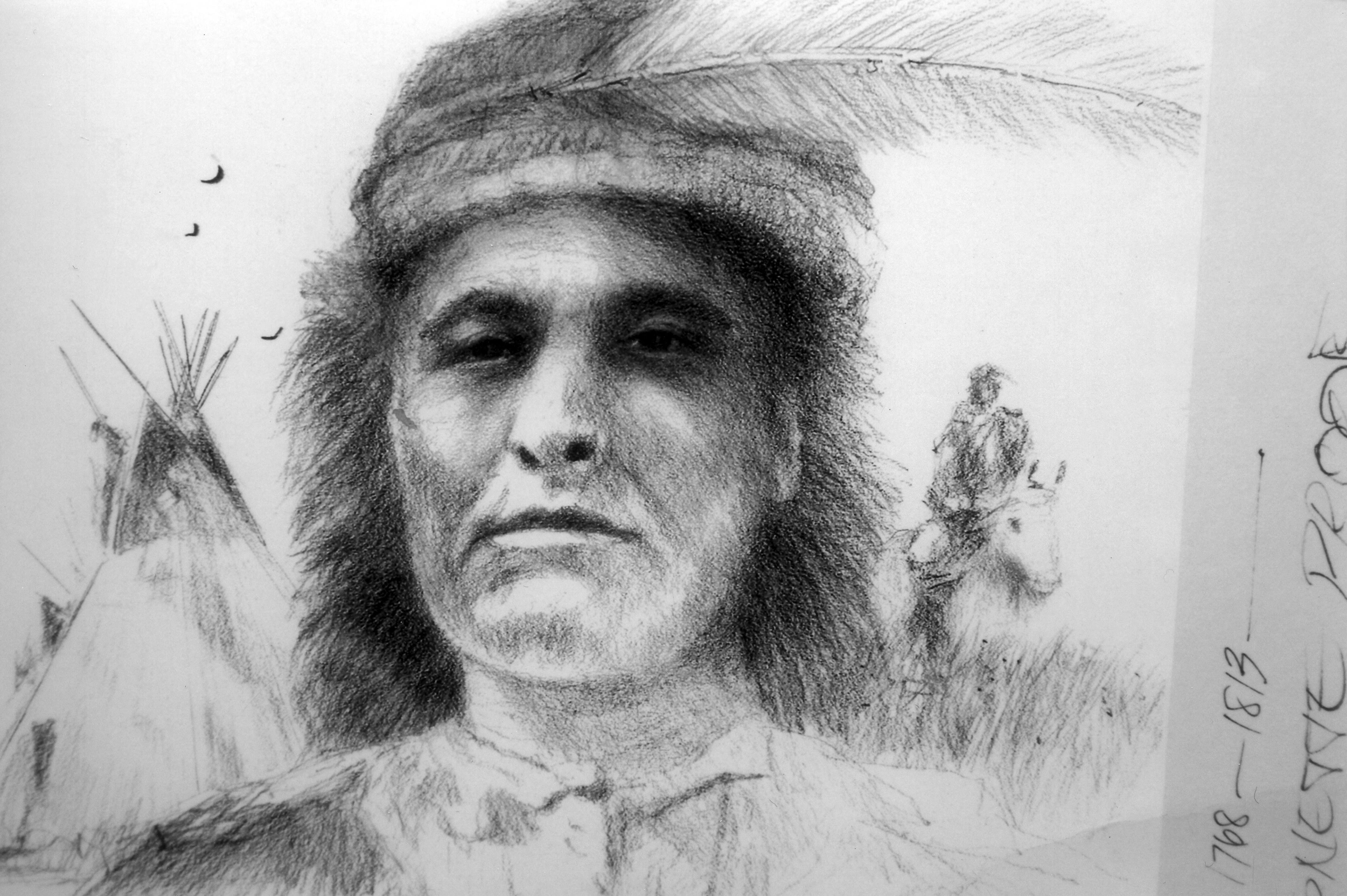 Jerry Baum sketch titled Identity of a Warrior--a portrait of the Shawnee warrior and chief Tecumseh. This is a close up of the first draft sketch. An award-winning artist, Jerry Baum attended F.J. Reitz High School, Indiana University and the University of Evansville. He is the son of the originator of this collection.