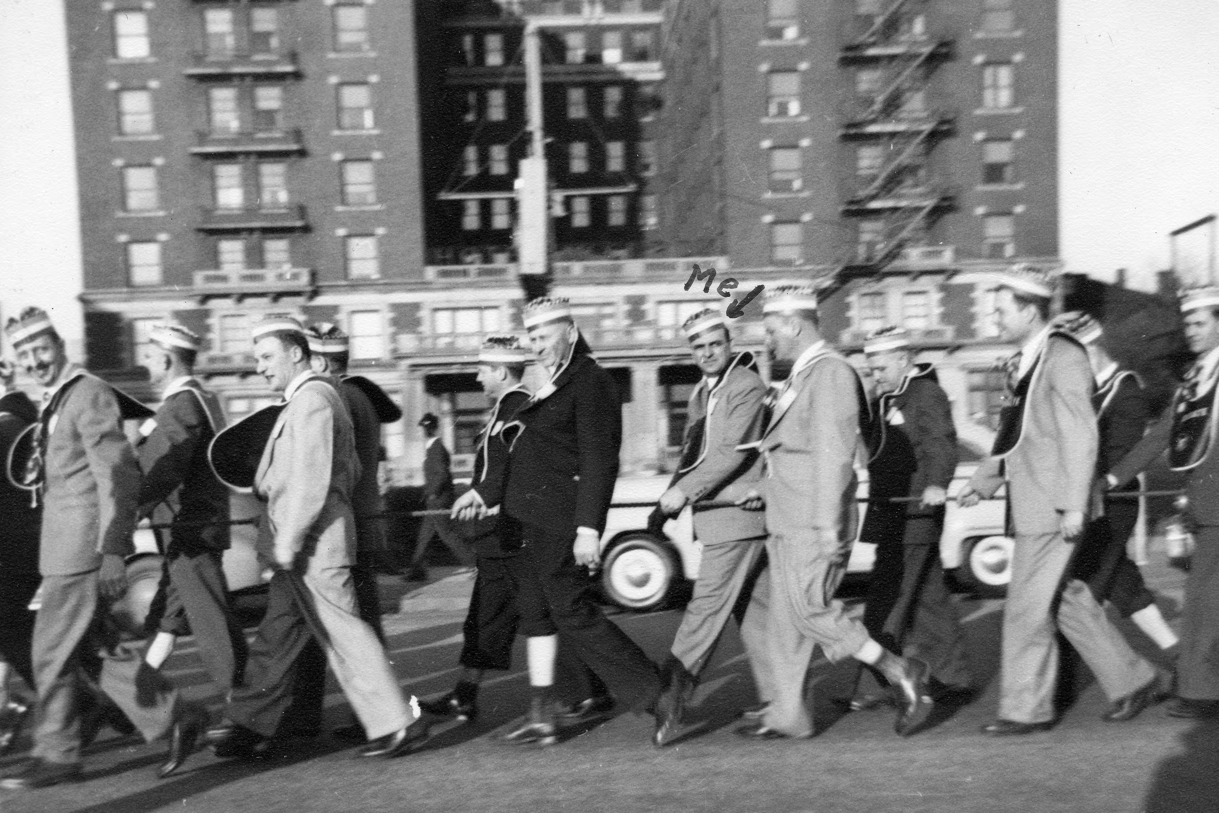 Shriner's parade on SE Riverside Dr., with Noel Baum, center. They are walking past the Hotel McCurdy at t 101-111 SE 1st St. (shown here is the rear of the building). While the building still stands, it is no longer a hotel. Baum is the originator of this collection and according to his obituary, a member of Masonic Reed Lodge, Hadi Shrine, and Scottish Rite of Evansville.