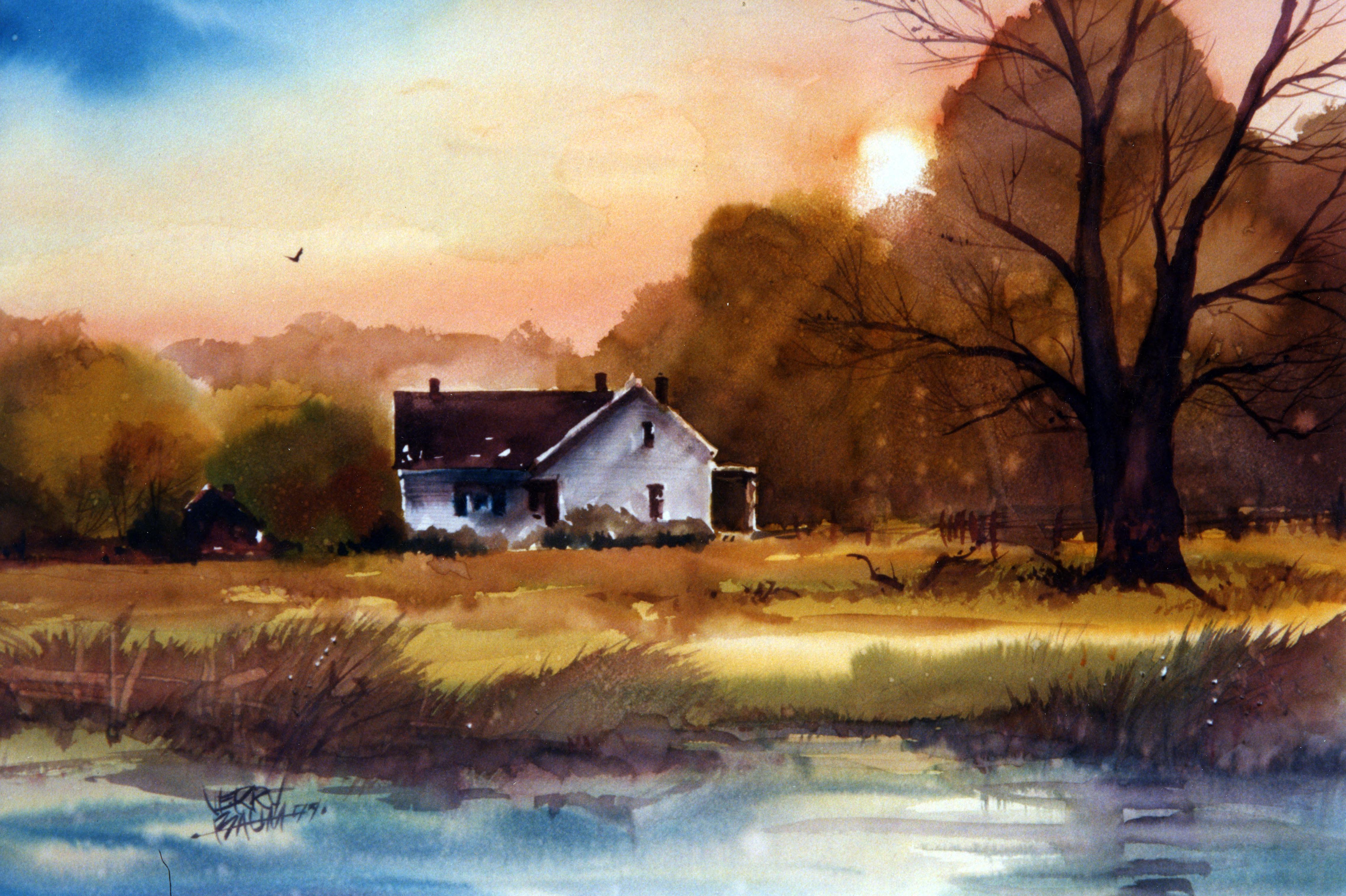 Jerry Baum watercolor of a house. An award-winning artist, Jerry Baum attended F.J. Reitz High School, Indiana University and the University of Evansville. He is the son of the originator of this collection.
