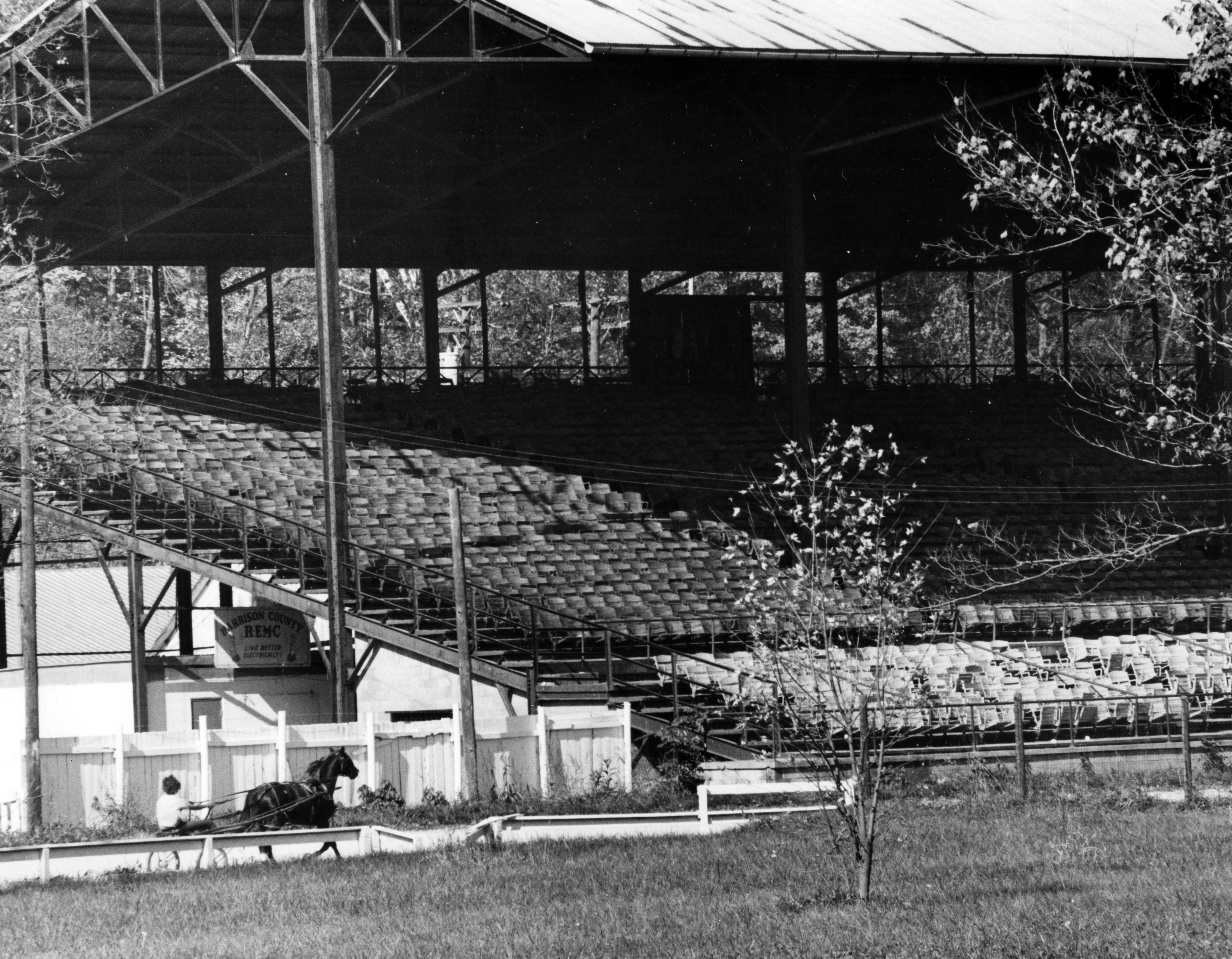 Man in sulky driving a trotter on the fairgrounds track at 341 Capital Ave.