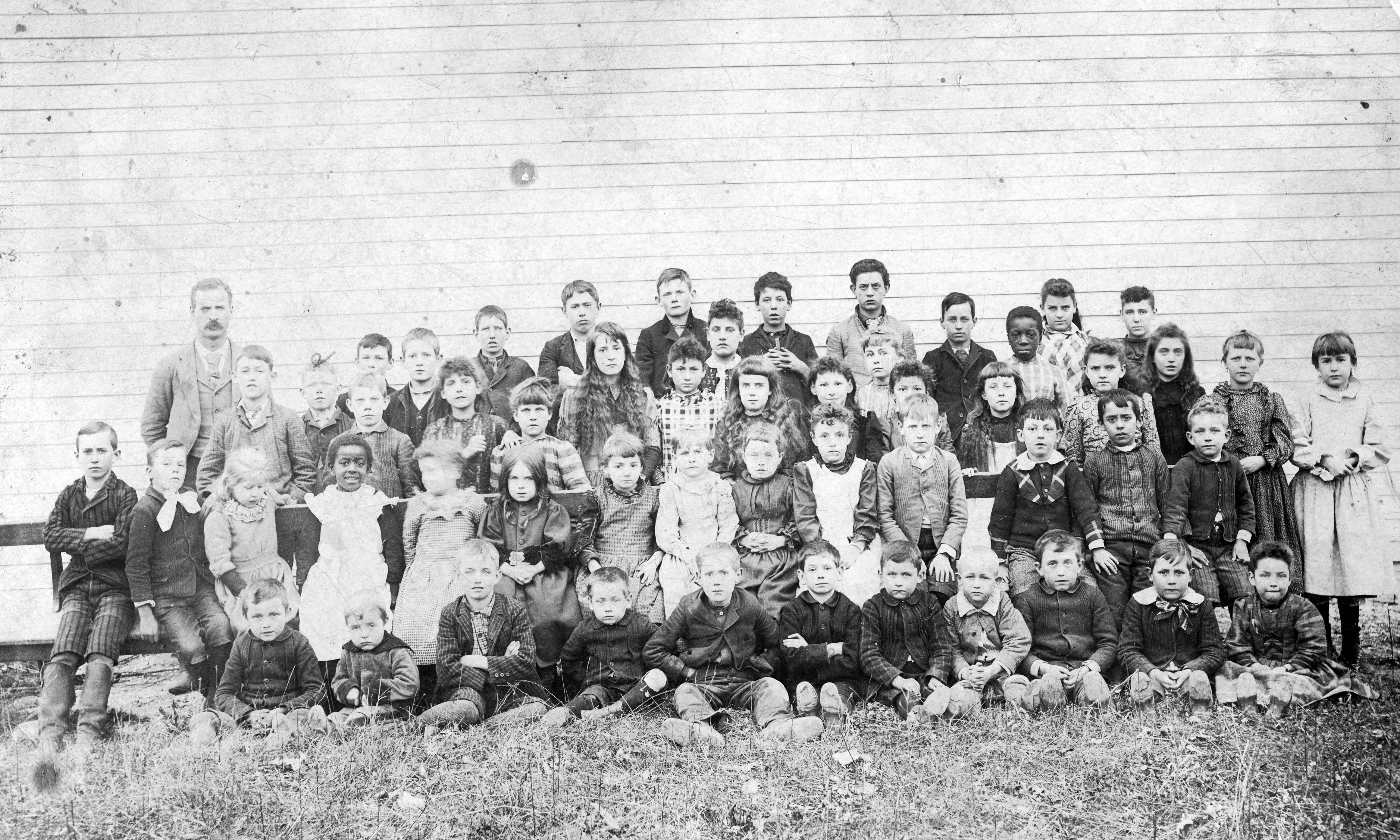 Unidentified photograph, given the different ages, this may be a school photograph, not just a class. The teacher is on the left, and there are some 52 students. NOTE There are two African American girls in this grouping. At the time of this photograph, segregation would have been in existence, so their presence is unusual. Also note the wear on some of the shoes of the children in the first row.