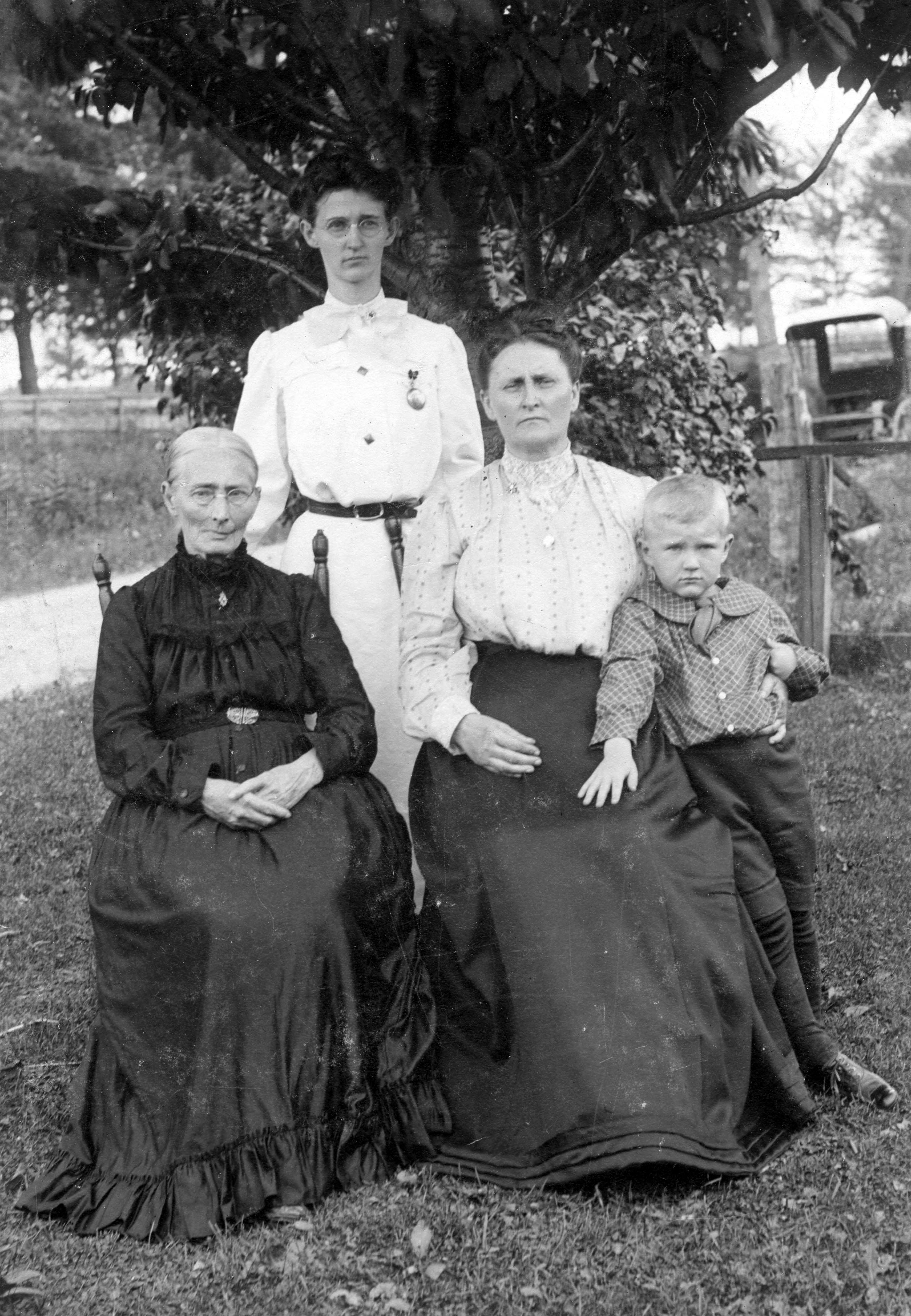 Mary E. Allen Bradway (1831-1905), Ida Alice Bradway Thomas (18591925, standing), Maud Thomas Johnston, and John Francis Johnston. Mary and Ida are mother and daughter and the maternal great-grandmother and grandmother, respectively, of the originator of this collection, Olive Carruthers Clifft. Who the Johnstons are is unknown, although it is possible that she is related to the John Thomas (husband of Ida) and John Francis her son.