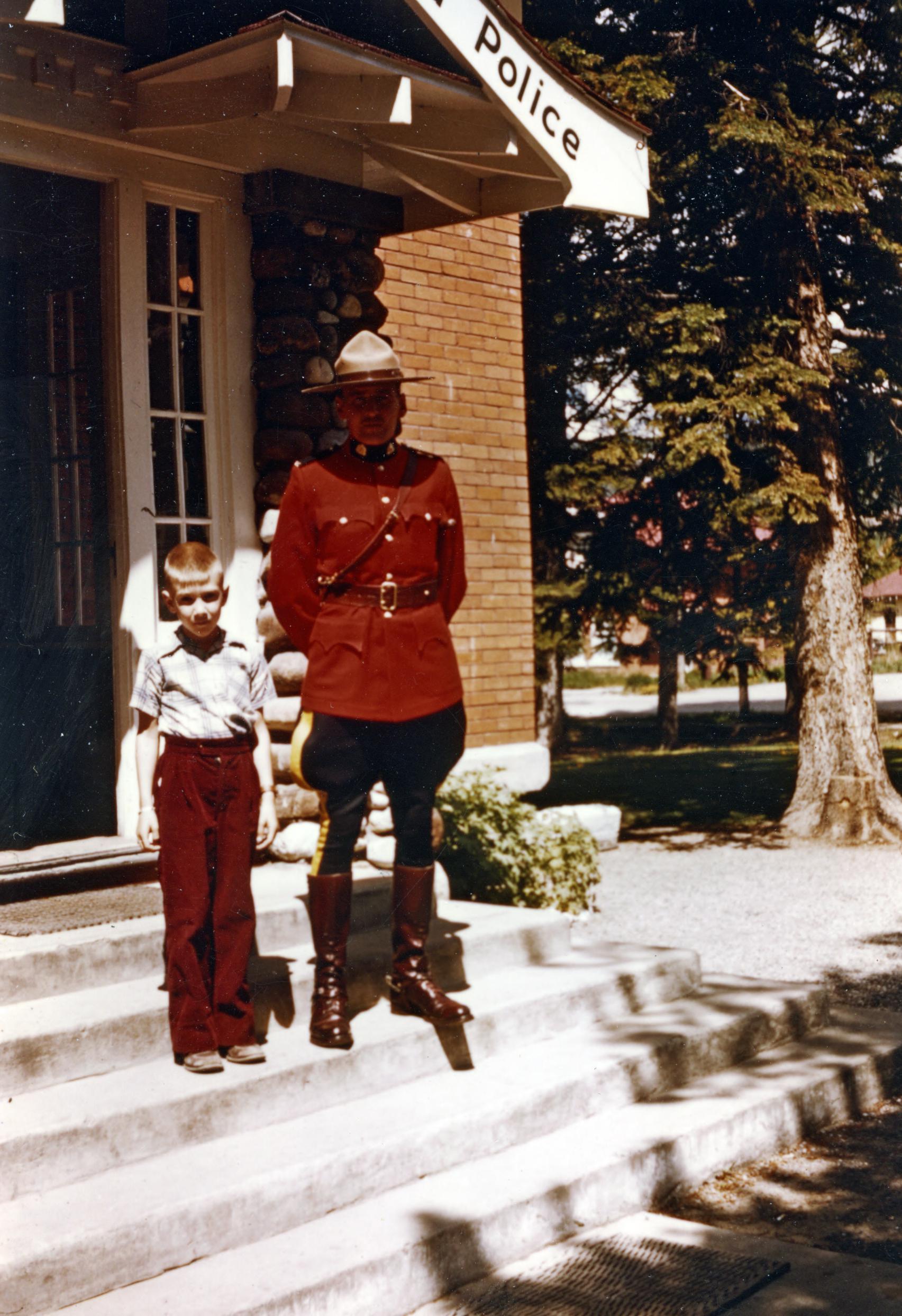 Unidentified boy and member of the Royal Canadian Mounted Police, standing on the steps of a police building. Banff National Park is Canada's oldest, established in 1885. It covers 2,564 sq. mi. in the Rocky Mountains.