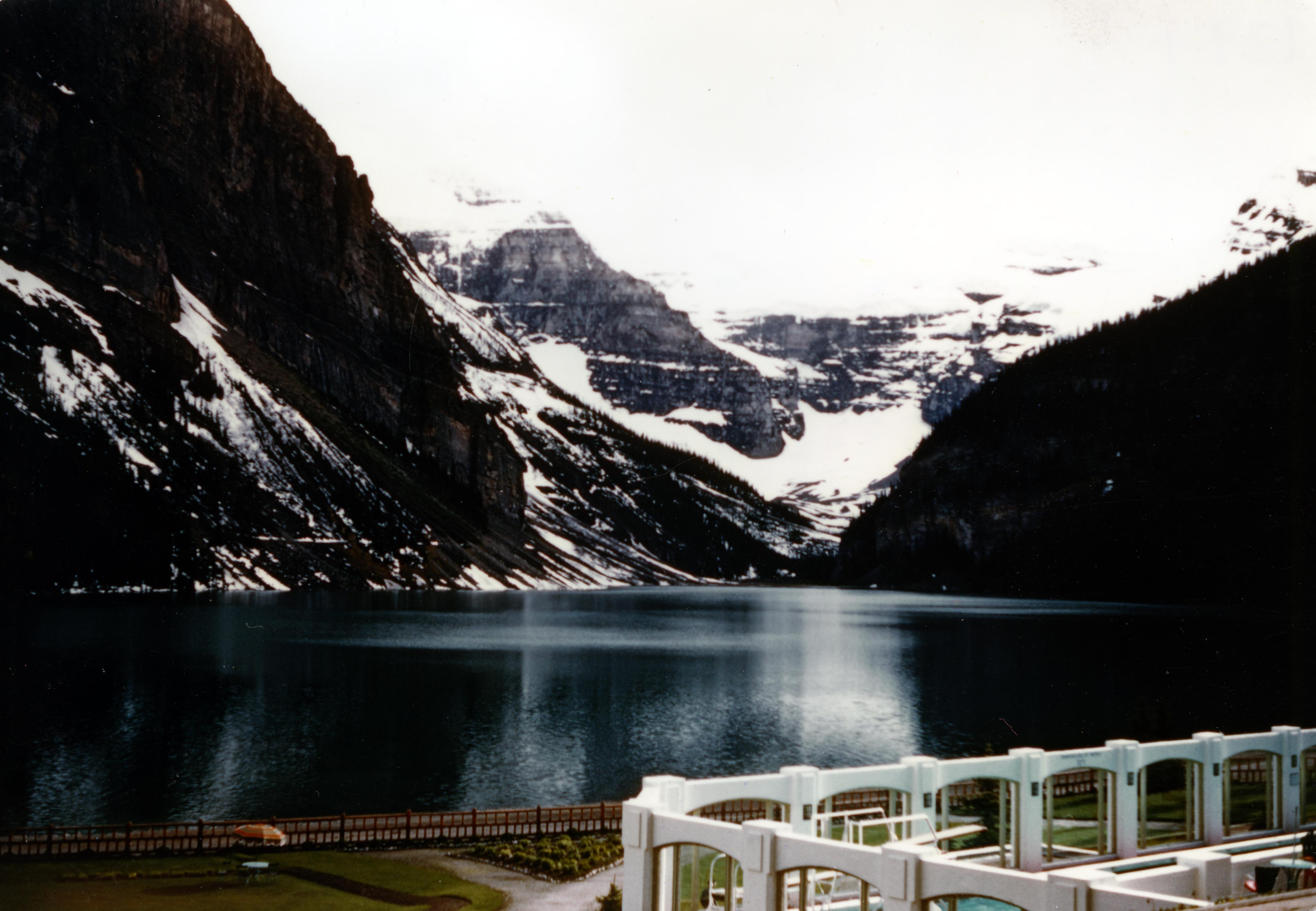 Lake Louise in Banff National Park, this view looks very much like that from the Fairmont Chateau Lake Louise hotel. The vibrant waters of Lake Louise are five kilometers (three miles) from the hamlet of Lake Louise. Named for Queen Victorias fourth daughter, Lake Louise is a truly awe-inspiring sight. The lake was previously known as Ho-Run-Num-Nay (the Lake of Lake of Little Fishes) by the Stoney Nakoda First Nations people. The hanging Victoria Glacier and an amphitheater of rugged peaks provide an imposing backdrop to the lake, which is about 2.5 kilometers (1.5 miles) long and 90 meters (295 feet) deep. During the summer the lake is an intense shade of turquoise, the result of light refracting off the rock flour (glacier silt) deposited in the lake by glacier run off. The color of the lake is most vibrant in July and August when the flow of the melt water is at its highest. At an elevation of 1,750 meters (5,740 feet), Lake Louise normally thaws in June. (https://www.banfflakelouise.com/lake-louise) Banff National Park is Canada's oldest, established in 1885. It covers 2,564 sq. mi. in the Rocky Mountains.