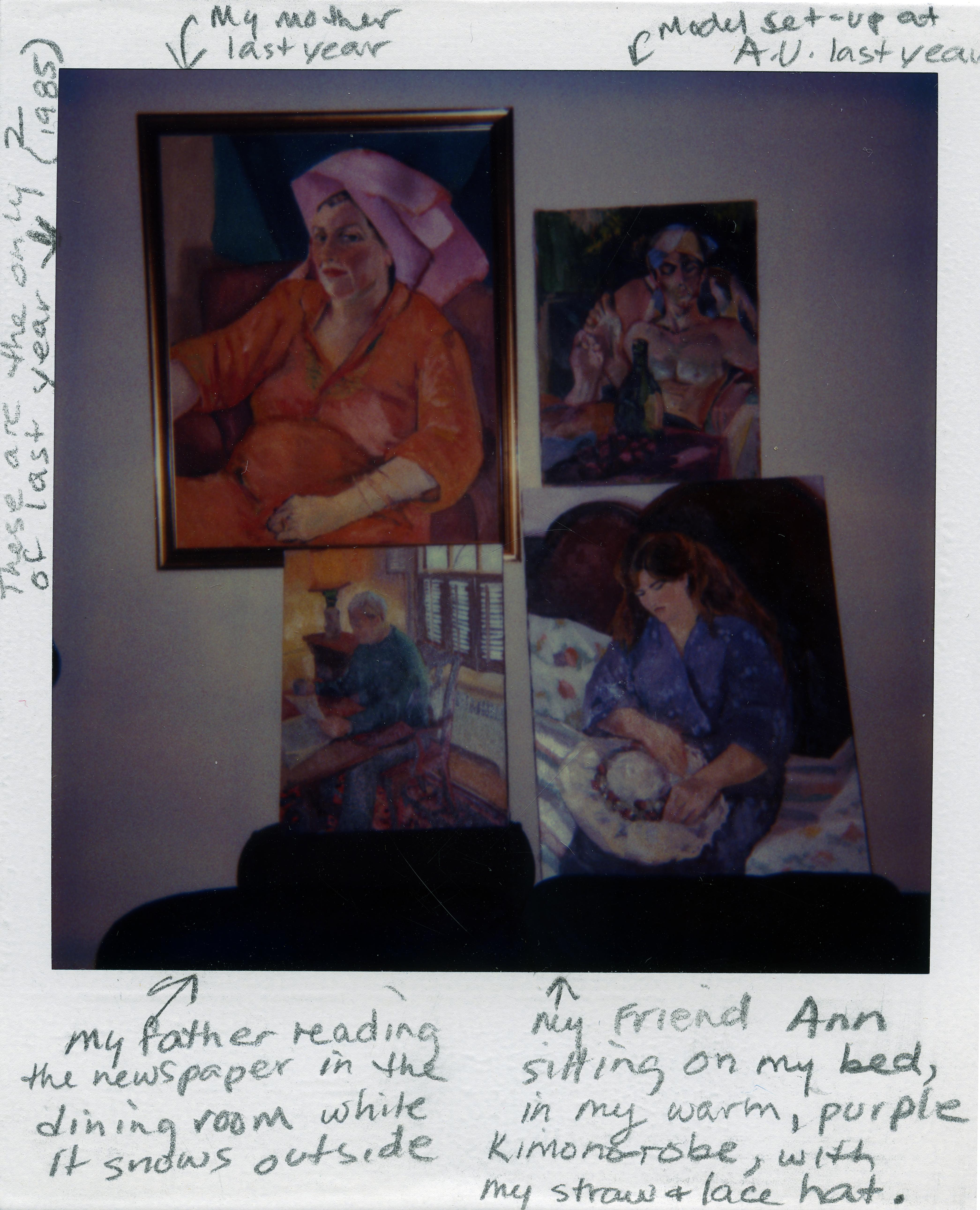 Artwork: my mother last year, model set-out A.U. last year, my father reading the newspaper in the dining room while it snows outside, my friend Ann sitting on my bed, in my warm, purple kimono-robe, with my straw and lace hat