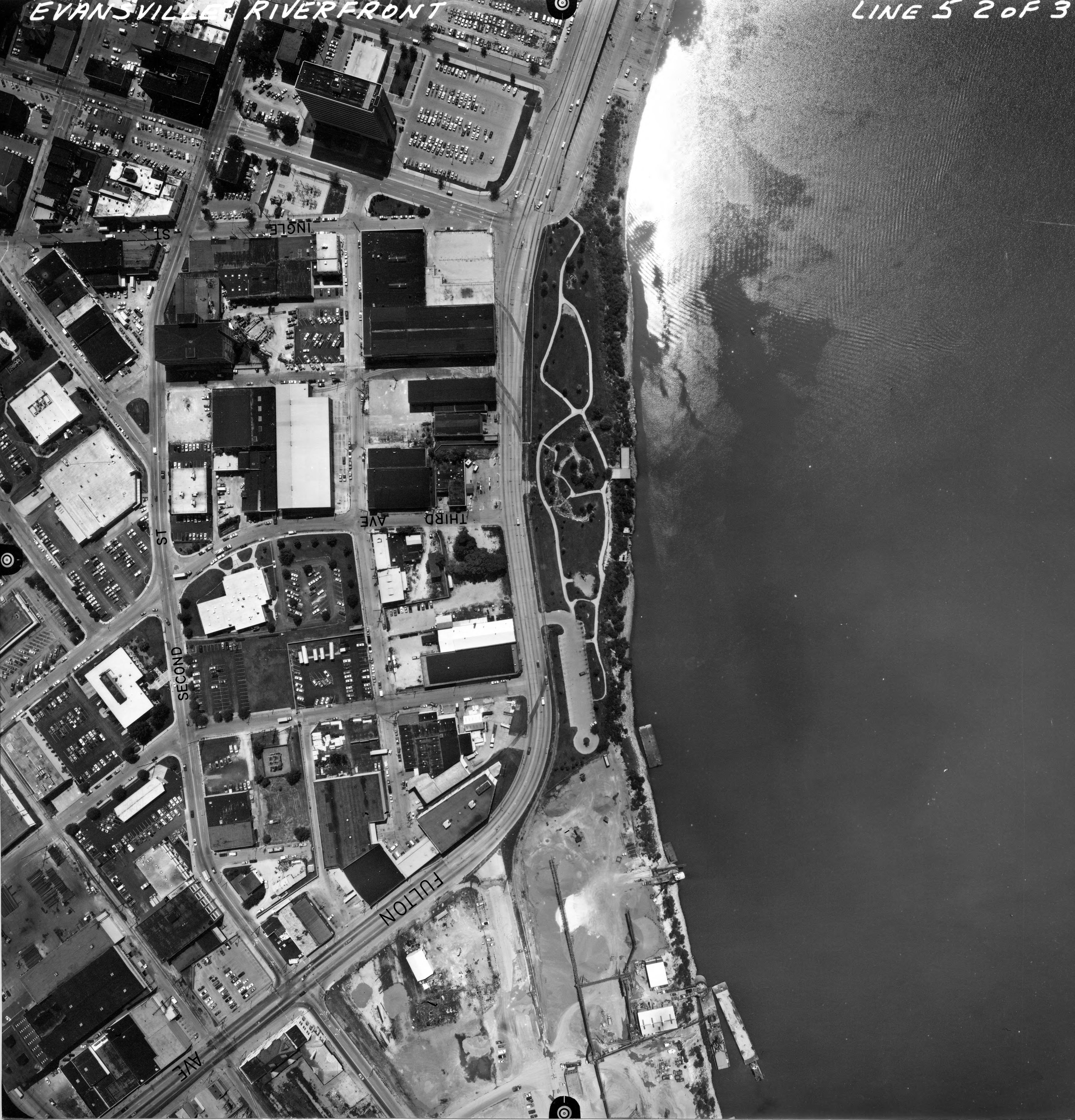 Aerial view of riverfront, with Second St. and Fulton Ave. labeled