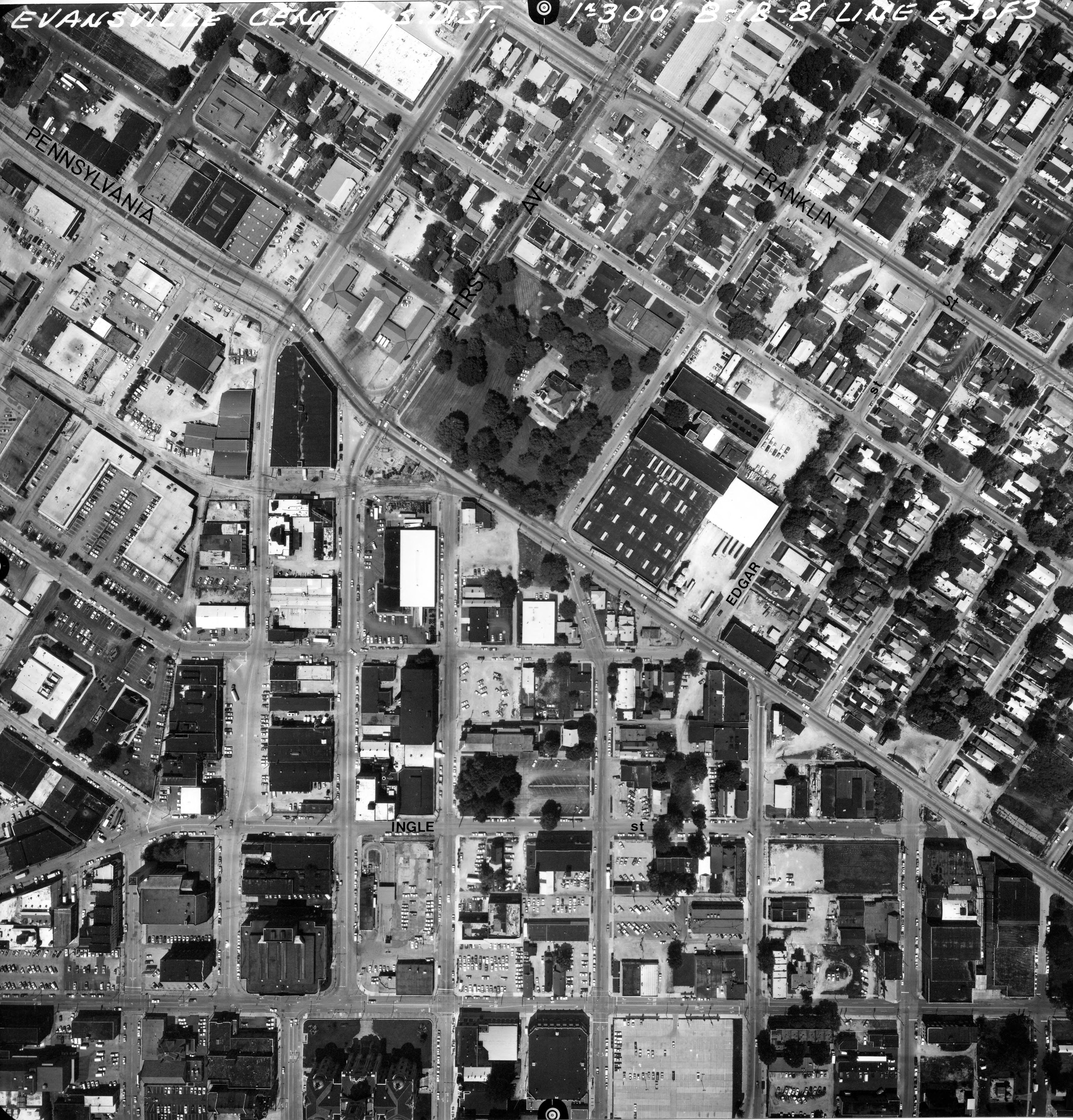 Aerial view of central business district with Ingle St., Pennsylvania St., Franklin St., First Ave., and Edgar St. labeled