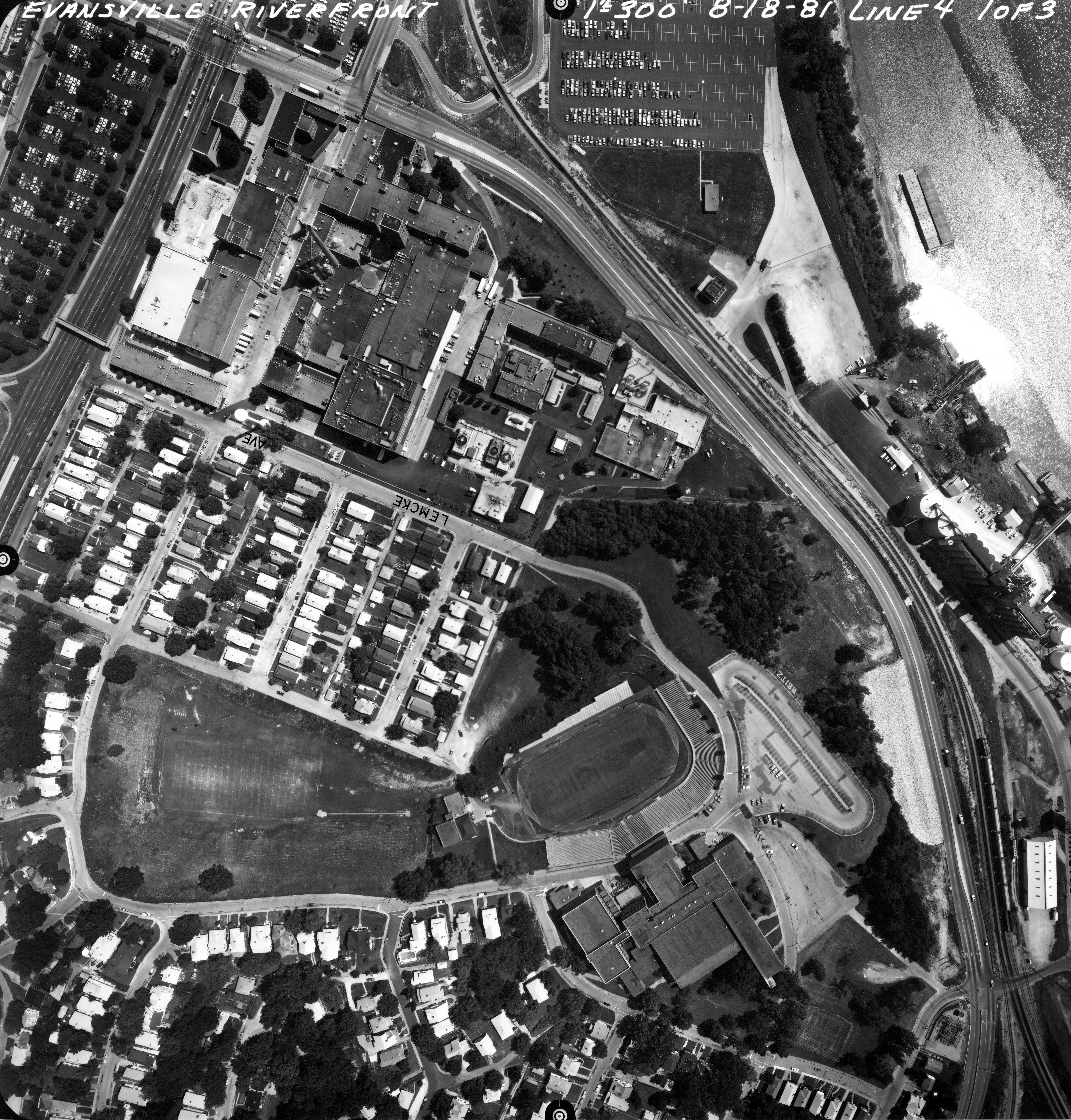 Aerial view of riverfront, with Lemcke Ave. labeled, showing the Reitz Bowl (football stadium for Francis Joseph Reitz High School)
