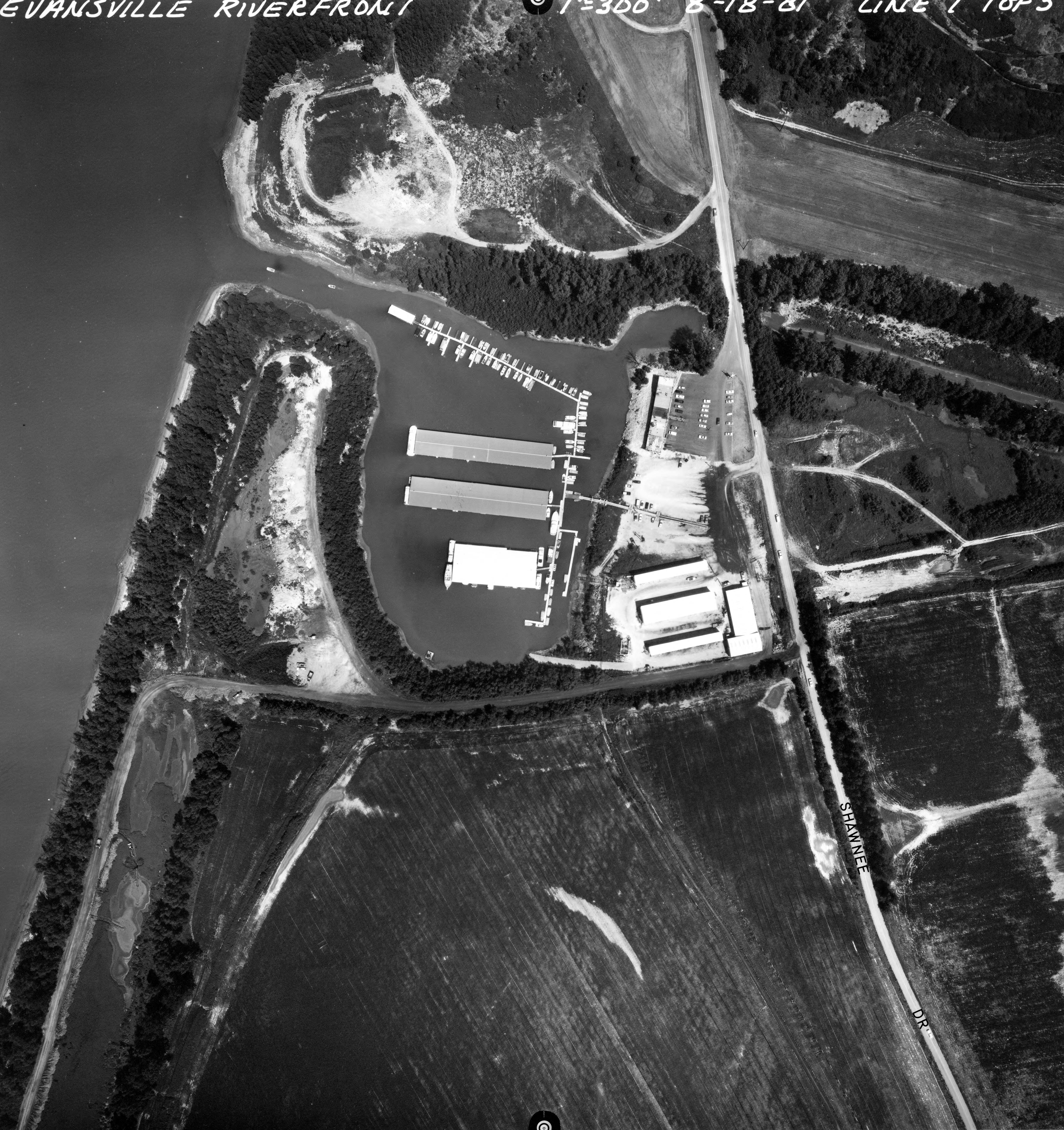 Aerial view of riverfront with Shawnee Dr. labeled and showing Inland Marina
