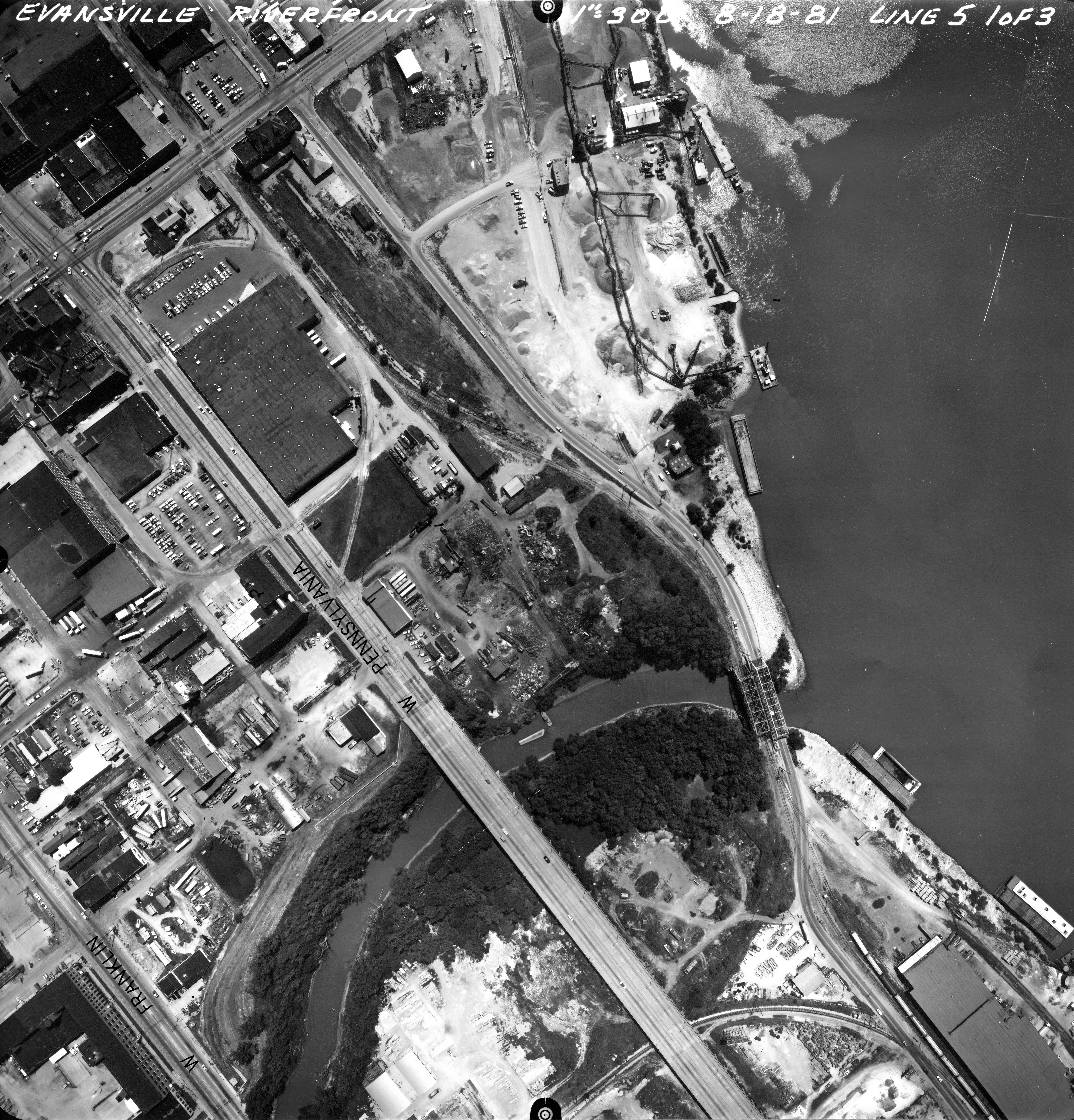Aerial view of riverfront, with W. Pennsylvania St. (now Lloyd Expressway) and W. Franklin St. labeled