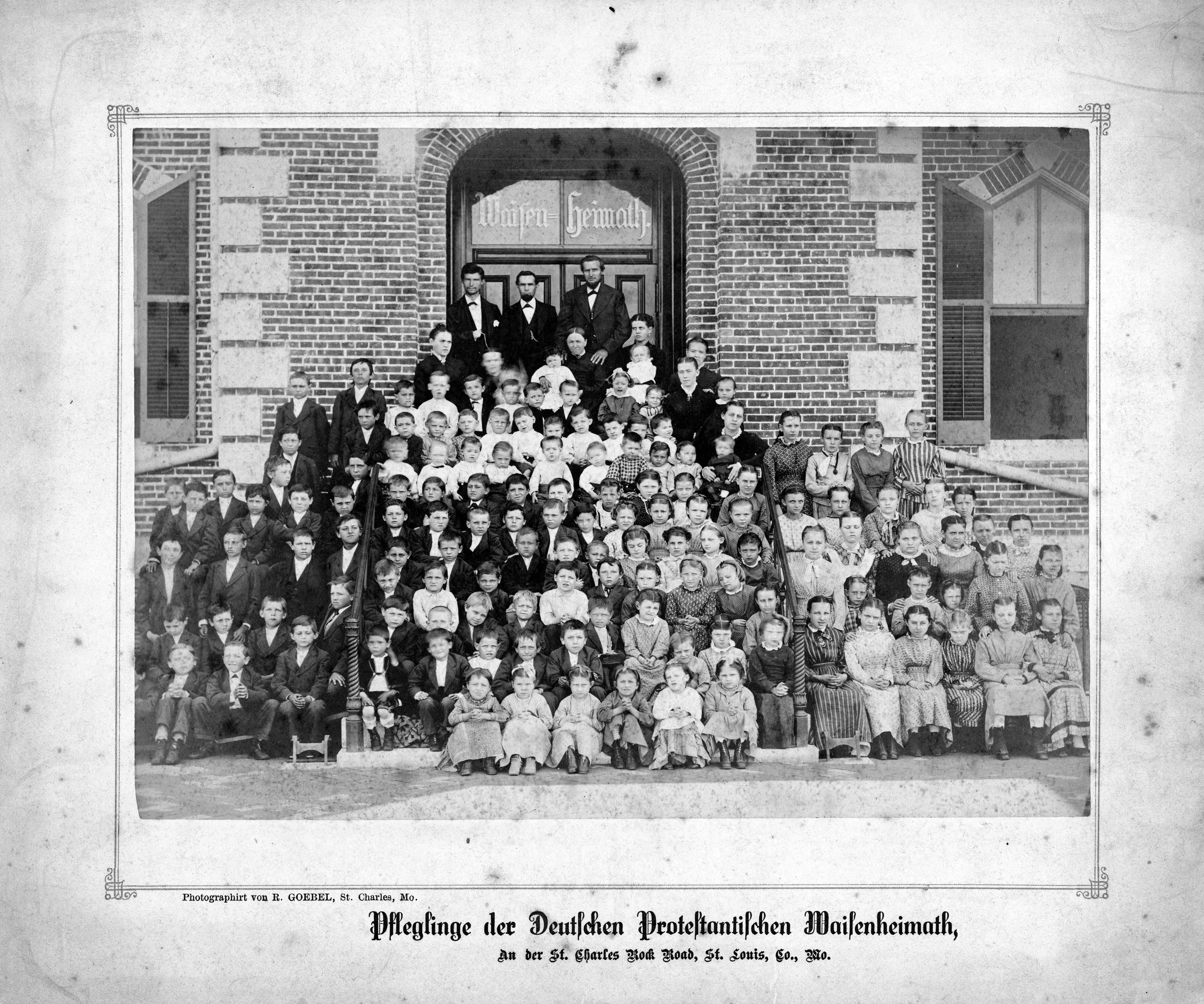 Mostly teachers, although there are some children present, of the German Protestant Orphans Home. ECH Every Child's Hope was founded on January 20, 1858 by Rev. Louis Nollau, as an orphanage for children whose immigrant parents had died from cholera outbreaks. Originally, one orphan boy was taken in by a St. Louis church, but that quickly grew to include approximately 50 children. Then called the German Protestant Orphan's Home, many of the children placed in the orphanage were found roaming the streets and sleeping in doorways. By the mid-1860s, programs were moved to our current location on St. Charles Rock Road and more than 300 orphans called ECH home. Renamed Evangelical Children's Home in 1945, as the needs of St. Louis youth evolved over the decades, services and programs adapted to meet those ever-changing needs. Today Every Child's Hope is no longer an orphanage, but caring for vulnerable children is still at the heart of each program. More than 200 staff members across St. Louis and Kansas City campuses are dedicated to preventing child abuse, treating emotional trauma and mental health issues, and providing aftercare and follow-up services. Each year ECH helps more than 1,400 youth and children find healing and hope for their futures.