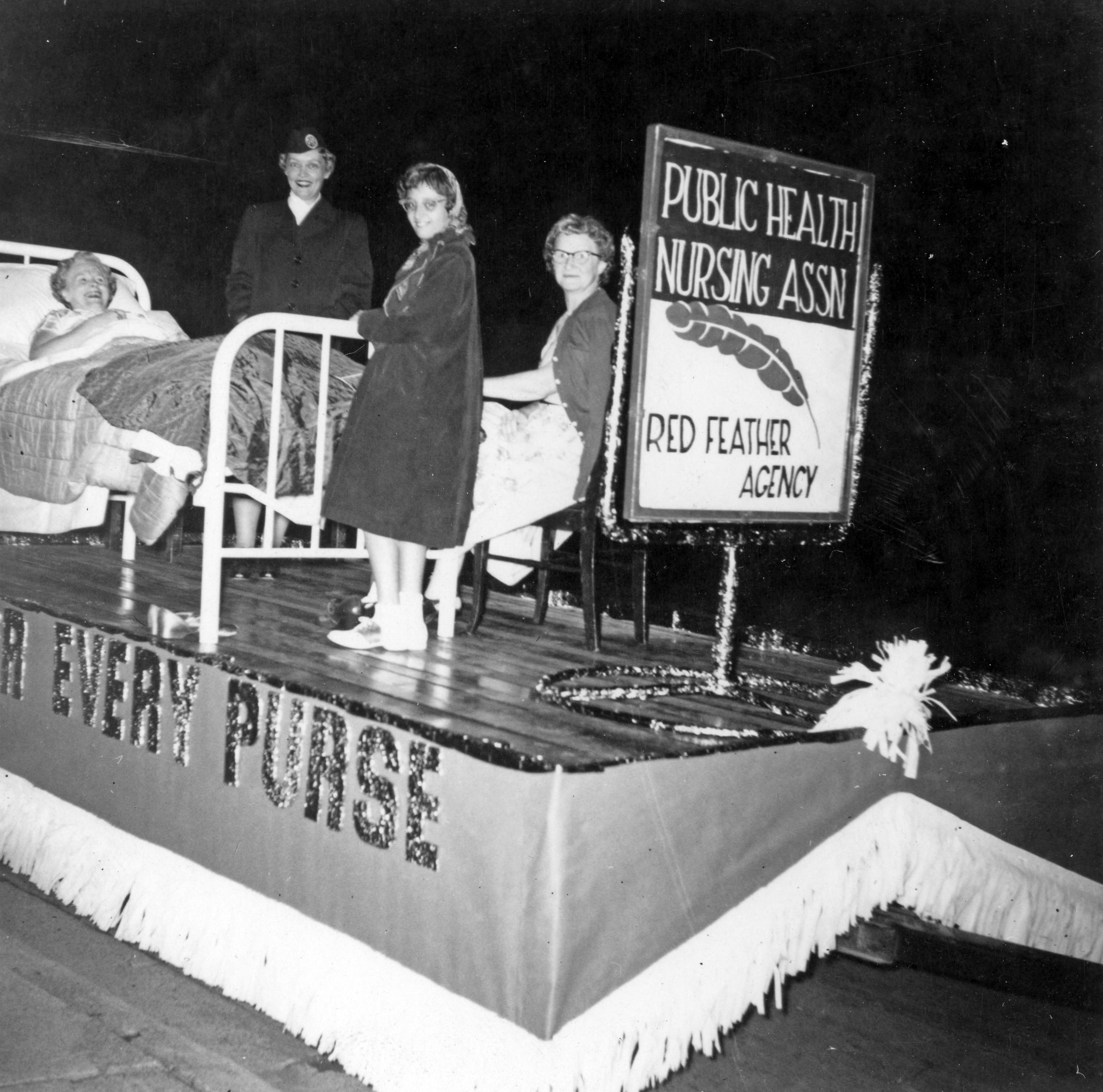 Public Health Nursing Association, a Red Feather Agency, float in a parade. A woman lies in a bed, surrounded by 2 family members (?) and a nurse. The float advertises A Nurse for Every Purse. (Not fully visible here--SEE MSS 045-011.)