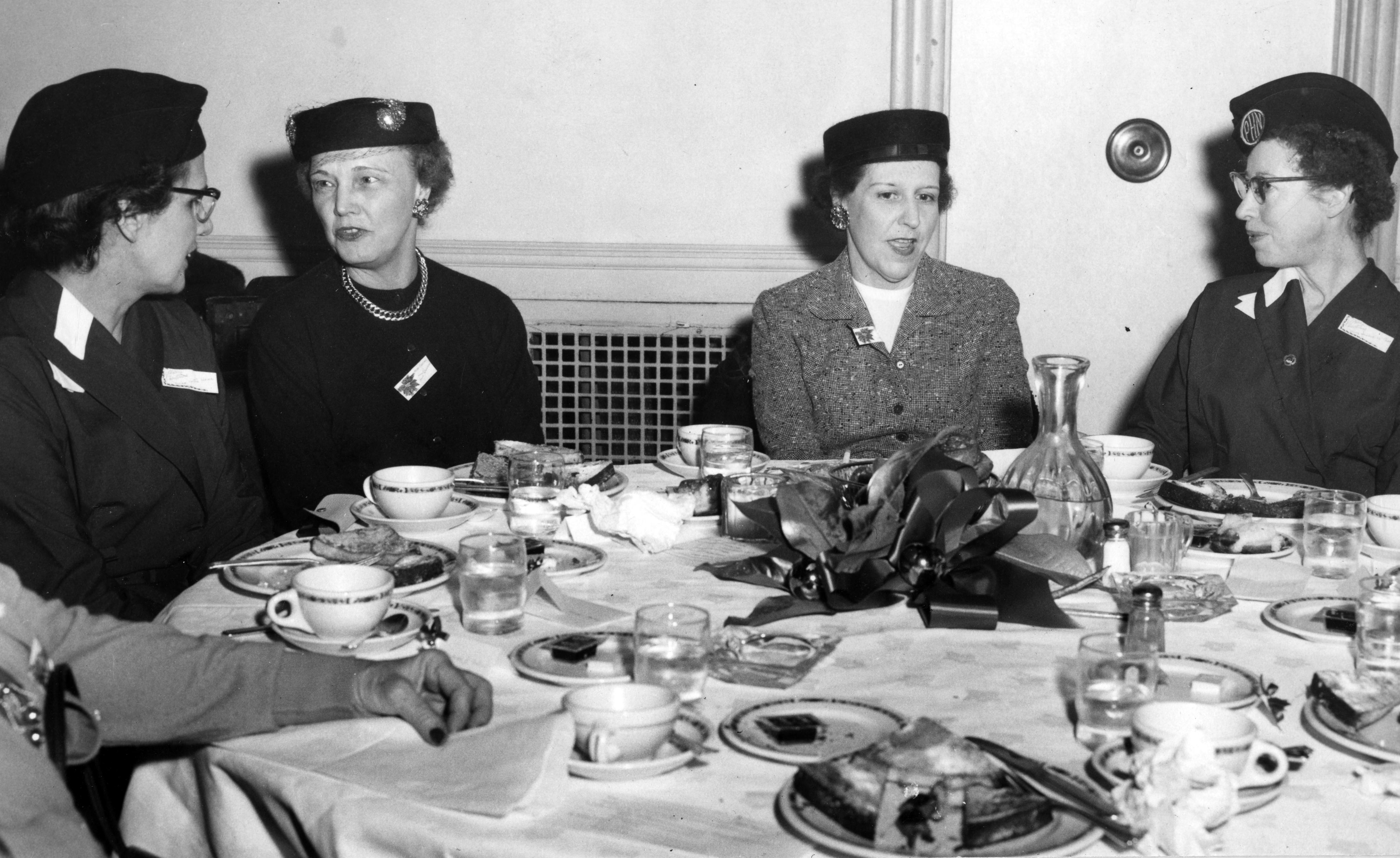Seated at one of the tables, from left, are Staff Nurse Nettie Haas, Mrs. James A. Bruner, association member, Mrs. Ralph Krauss, board member, and Mrs. Isabel W. Cass, staff nurse. Further identification: Nettie M. Haas (1904-1998), probably June Cecil Bruner (1906-1983), possibly Mary Mildred Krauss (1911-1977), probably Isabel Williamson Cass (1906-2003)