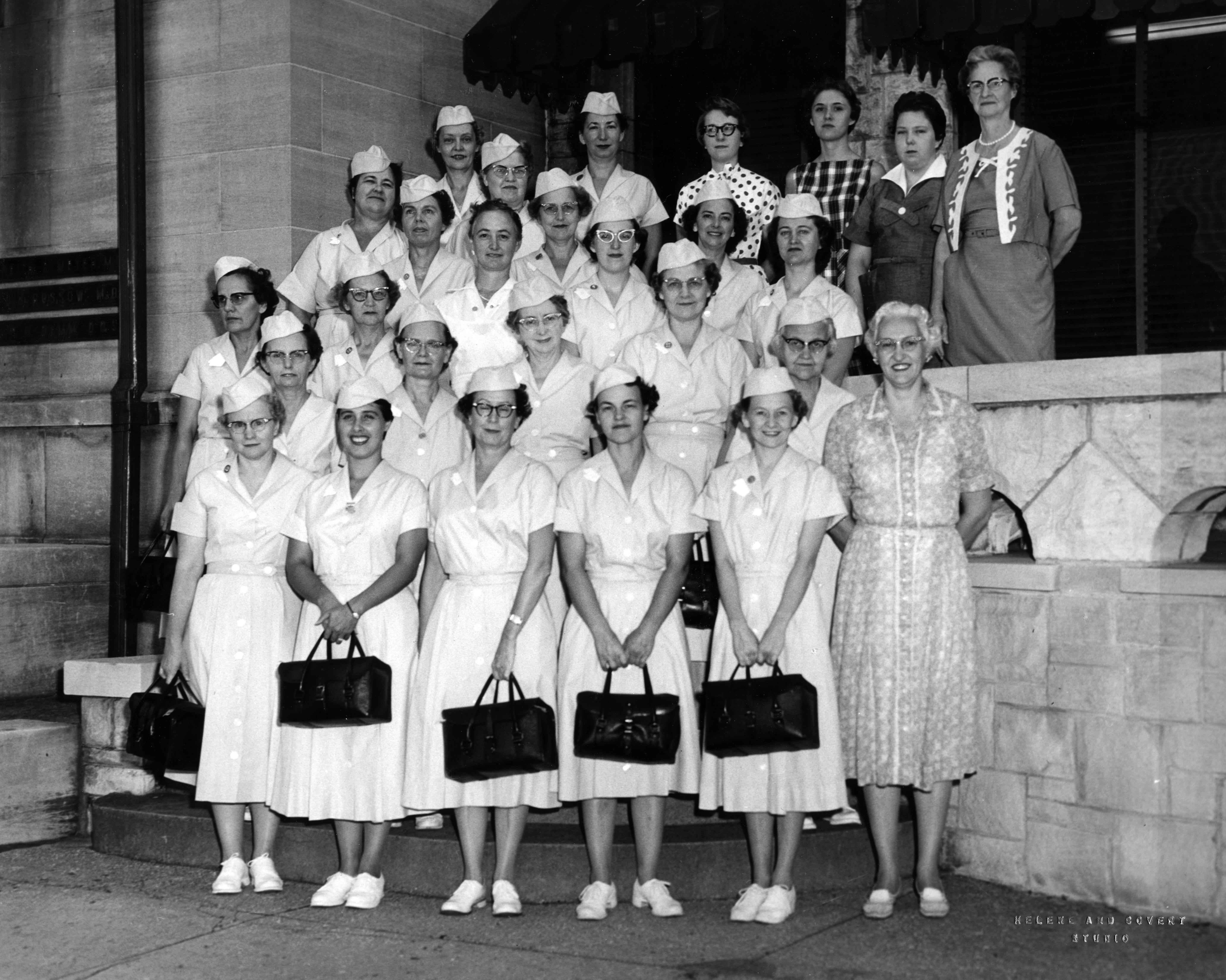 Nurses and Caroline Quigley, PHNA executive director. Some of the women in the rear not wearing uniforms might be board members. They are standing in front of the association's headquarters at 120 SE 1st St. Probably M. Caroline Quigley (1909-1995).
