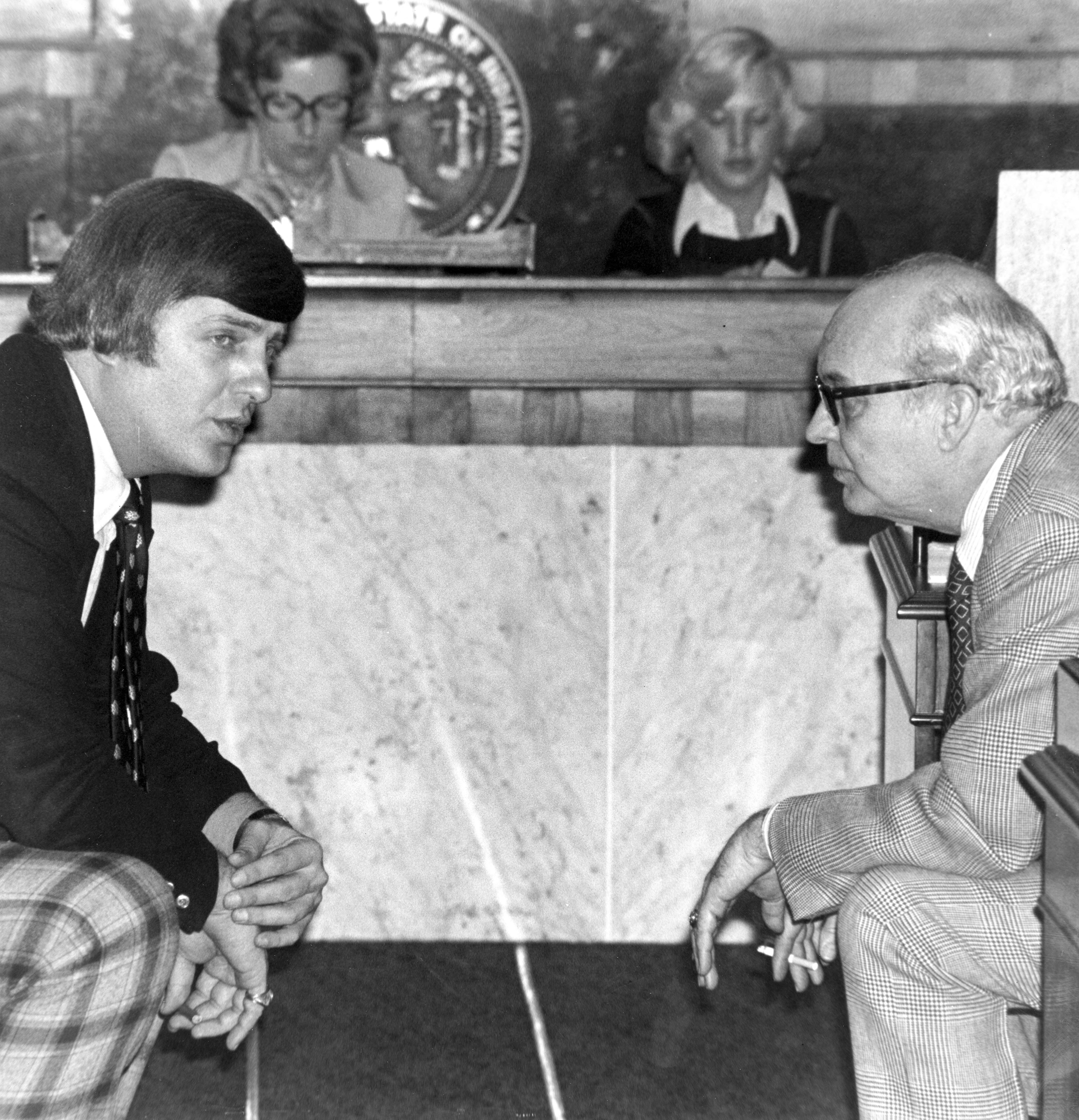 Robert J. Fair, right, speaking to an unidentified man in the Indiana Senate chambers