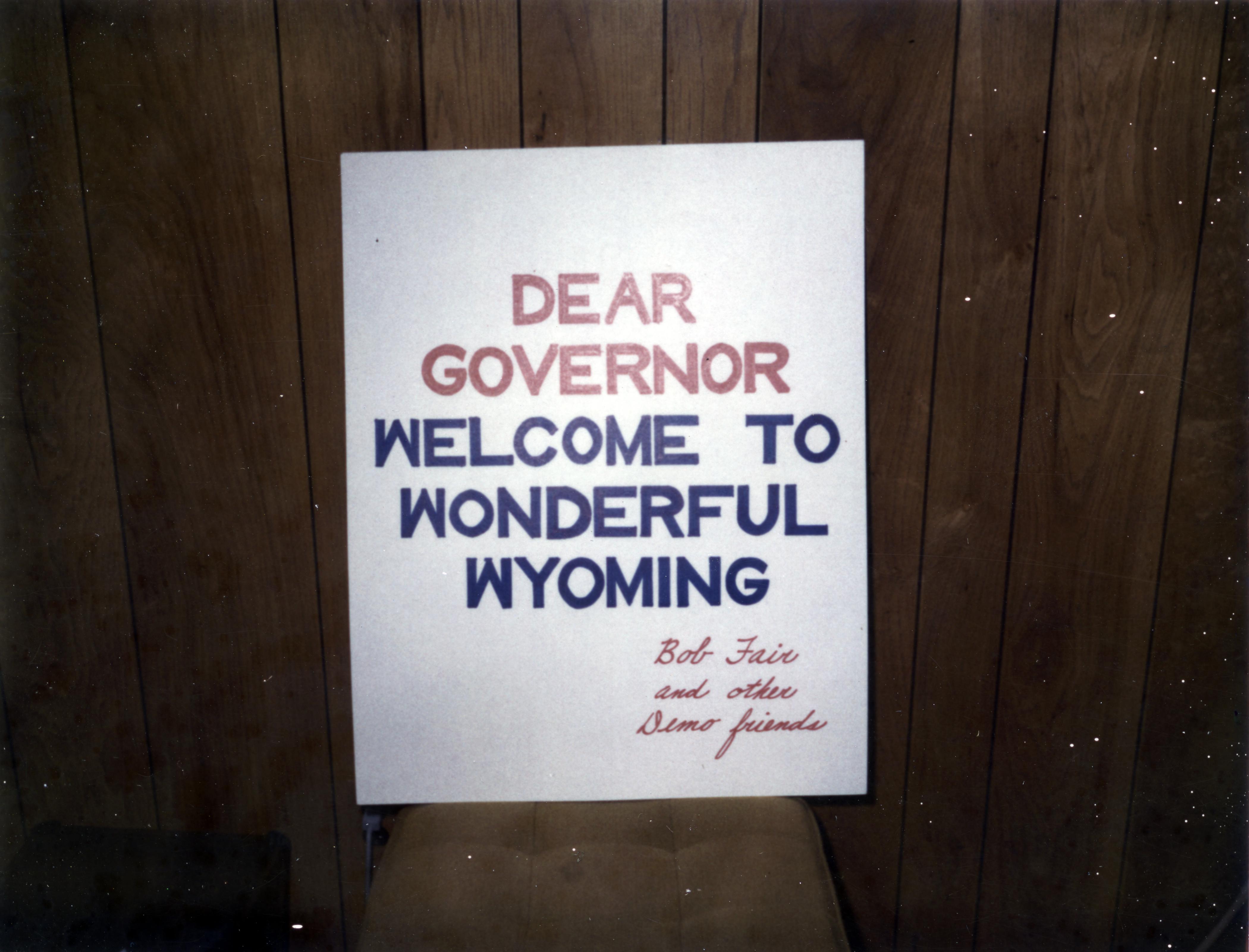 Sign welcoming the governor to wonderful Wyoming, signed by Robert J. Fair and other Democratic friends