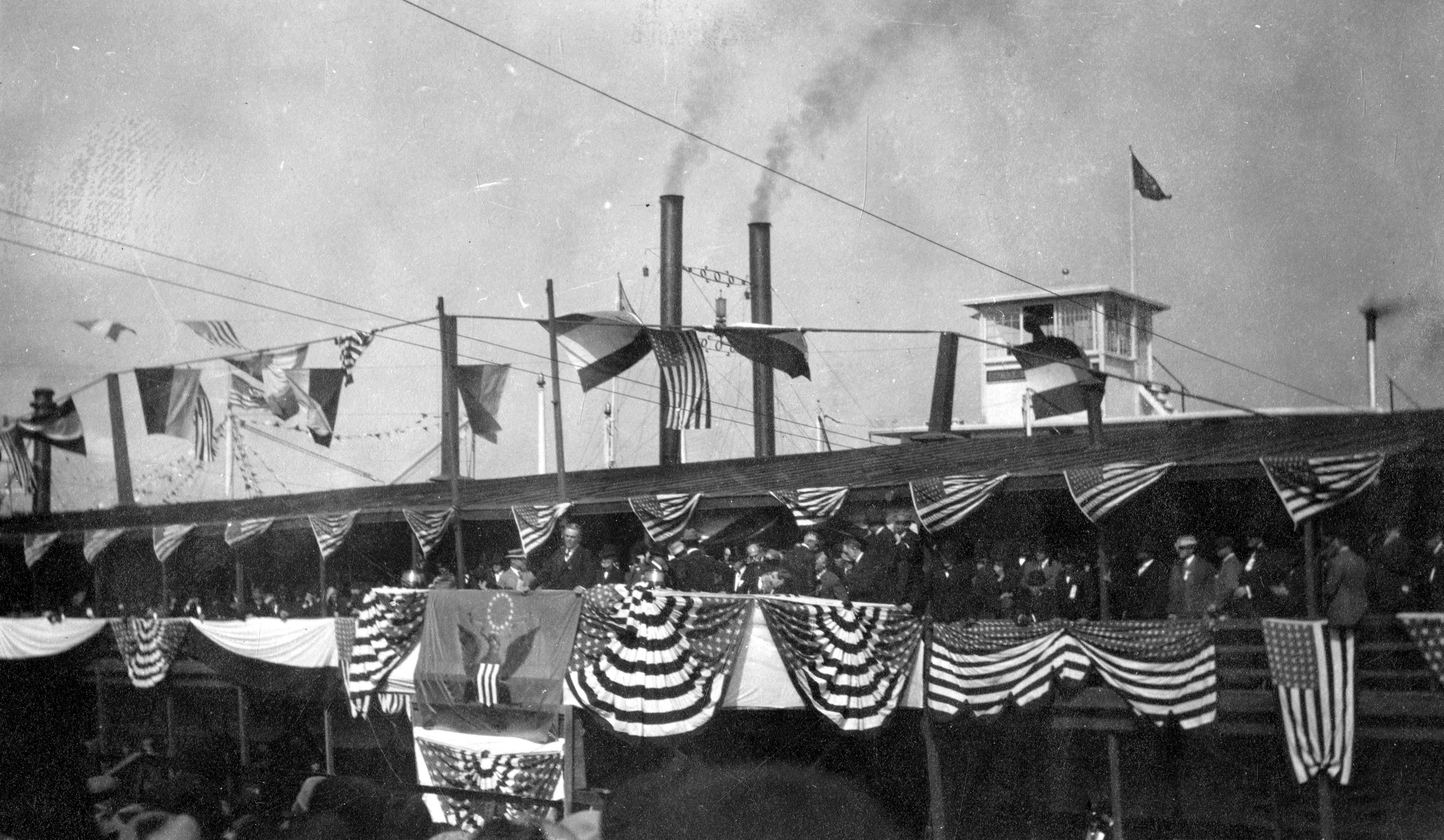 Politicians speaking to the crowd as part of President Howard Taft's trip to New Orleans to attend the Great Waterways Convention. He left St. Louis on October 25, 1909 and planned to stop in Cape Girardeau, MO, Cairo, IL, Hickman, KY, Memphis, TN, Helena, AR, and Vicksburg and Natchez, MS, before arriving in New Orleans on the 30th. The Oleander, which carried President Howard Taft down the Mississippi to New Orleans, was joined by his fleet (other boats carried 24 governors and about 200 congressmen and senators) and were also joined along the way by boats from various river states carrying delegates to the great Waterways Convention, sponsored by the Lakes-to-the-Gulf Deep Waterways Association in New Orleans from October 30 to November 2. Some 50,000 to 100,000 people were expected to attend.