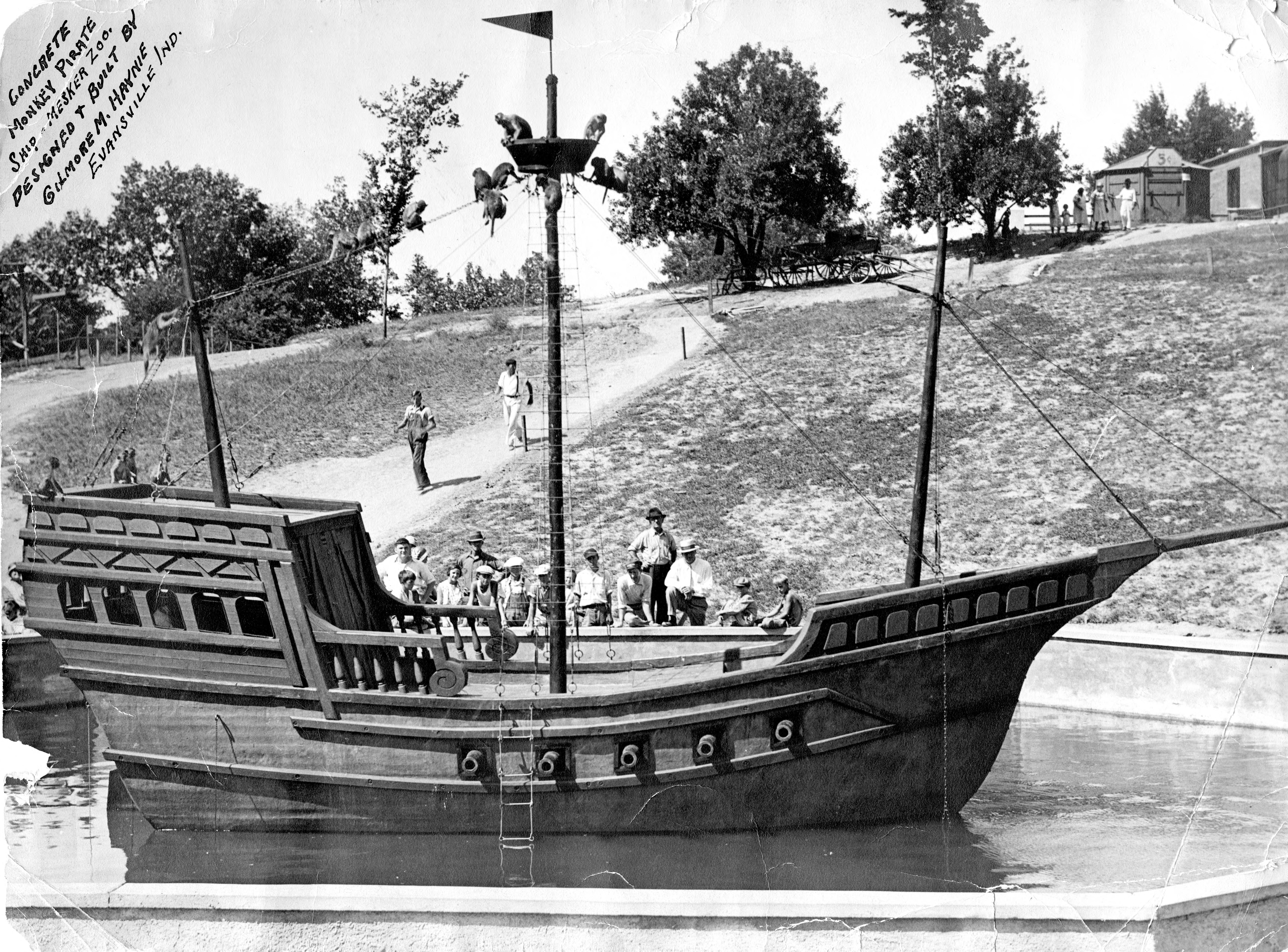 Concrete Monkey Pirate Ship-- Mesker Zoo. Designed & built by Gilmore M. Haynie Evansville, Indiana. In 1916, Mesker Park was no more than a cluttered and undeveloped picnic area. Thanks to a $25,000 cash gift George Mesker gave to the city to purchase more land around the park, the dilapidated 50-acres became the site to one of the finest zoos in the country. Gilmore M. Haynie, visionary and proponent of the Park's transformation, became the executive secretary of the city park board in 1916, and later the board's president. Once Mesker's donation was realized, both Haynie and Mayor Benjamin Bosse created a plan to change the face of Mesker Park. The next 15 years saw weeds pulled, paths built, lights added, areas cleared, and a fine menagerie of random critters added to the planned zoo, featuring a goat, three rabbits, one raccoon, and six chickens. Belle and Brutus, the main attractions, were gifted lions from the American Circus Association, followed by a black bear from the Denver Zoo. On June 14, 1929, the park acquired its biggest creature when Kay, an 11,000-pound elephant, joined the team. Haynie utilized Works Progress Administration labor and efficient building strategies to do with $250,000 dollars what $2 million projected dollars would have done. He oversaw the design and construction of one the first barless bear exhibits in the country, followed by the unique, one-third concrete scale model of Christopher Columbus' Santa Maria, crewed by 20 rhesus monkeys. Haynie, whose wife Mildred founded Haynie Travel in 1938, was a world traveler who was inspired by zoos he visited in Germany for these ideas. Barless exhibits became the zoological standard for innovative and best practices largely due to the concepts he introduced in Evansville. In 1936, Mesker donated more funds to build the Mesker Amphitheatre that boasted seating room for 8,500. Mesker Park Zoo was rapidly becoming Evansville's number one attraction, receiving international renown for its ingenuity, creativity, and unique topographical use of space. During the zoo's initial design, Haynie contributed to another innovative barless den, this time for the lions, with spot-on botanical accuracy and an imitation African watering hole smack dab in the center of the zoo. It created a draw, says Amos Morris, current director of the zoo. The lions would stand on a pinnacle, and as you walk around the perimeter of the zoo you could almost always see them. (http://www.evansvilleliving.com/articles/its-a-zoo-out-there) Gilmore Haynie is the grandfather to the originator of this collection.