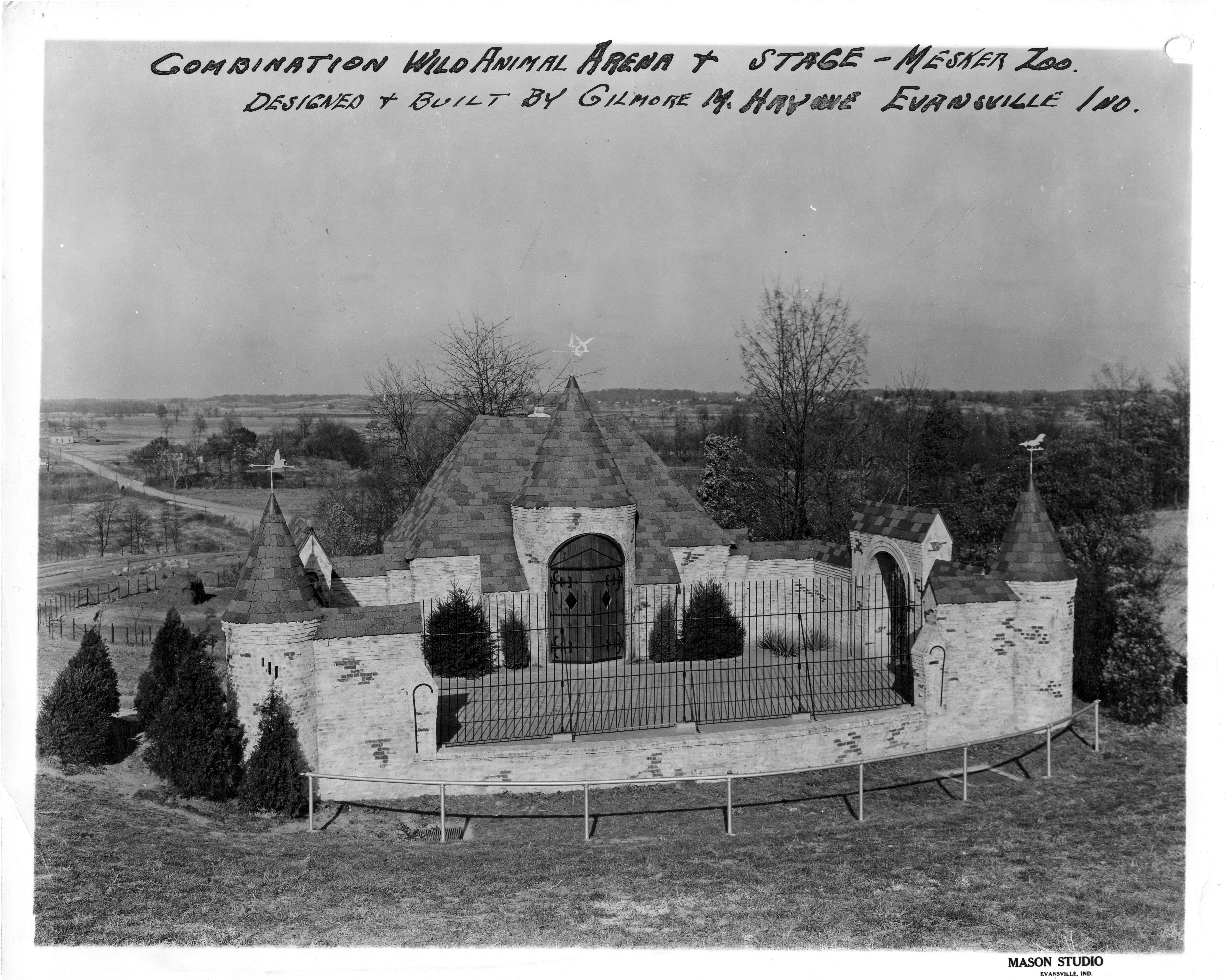 Combination wild animal arena + stage-- Mesker Zoo. Designed & built by Gilmore M. Haynie Evansville, Indiana. In 1916, Mesker Park was no more than a cluttered and undeveloped picnic area. Thanks to a $25,000 cash gift George Mesker gave to the city to purchase more land around the park, the dilapidated 50-acres became the site to one of the finest zoos in the country. Gilmore M. Haynie, visionary and proponent of the Park's transformation, became the executive secretary of the city park board in 1916, and later the board's president. Once Mesker's donation was realized, both Haynie and Mayor Benjamin Bosse created a plan to change the face of Mesker Park. The next 15 years saw weeds pulled, paths built, lights added, areas cleared, and a fine menagerie of random critters added to the planned zoo, featuring a goat, three rabbits, one raccoon, and six chickens. Belle and Brutus, the main attractions, were gifted lions from the American Circus Association, followed by a black bear from the Denver Zoo. On June 14, 1929, the park acquired its biggest creature when Kay, an 11,000-pound elephant, joined the team. Haynie utilized Works Progress Administration labor and efficient building strategies to do with $250,000 dollars what $2 million projected dollars would have done. He oversaw the design and construction of one the first barless bear exhibits in the country, followed by the unique, one-third concrete scale model of Christopher Columbus' Santa Maria, crewed by 20 rhesus monkeys. Haynie, whose wife Mildred founded Haynie Travel in 1938, was a world traveler who was inspired by zoos he visited in Germany for these ideas. Barless exhibits became the zoological standard for innovative and best practices largely due to the concepts he introduced in Evansville. In 1936, Mesker donated more funds to build the Mesker Amphitheatre that boasted seating room for 8,500. Mesker Park Zoo was rapidly becoming Evansville's number one attraction, receiving international renown for its ingenuity, creativity, and unique topographical use of space. During the zoo's initial design, Haynie contributed to another innovative barless den, this time for the lions, with spot-on botanical accuracy and an imitation African watering hole smack dab in the center of the zoo. It created a draw, says Amos Morris, current director of the zoo. The lions would stand on a pinnacle, and as you walk around the perimeter of the zoo you could almost always see them. (http://www.evansvilleliving.com/articles/its-a-zoo-out-there) Gilmore Haynie is the grandfather to the originator of this collection.
