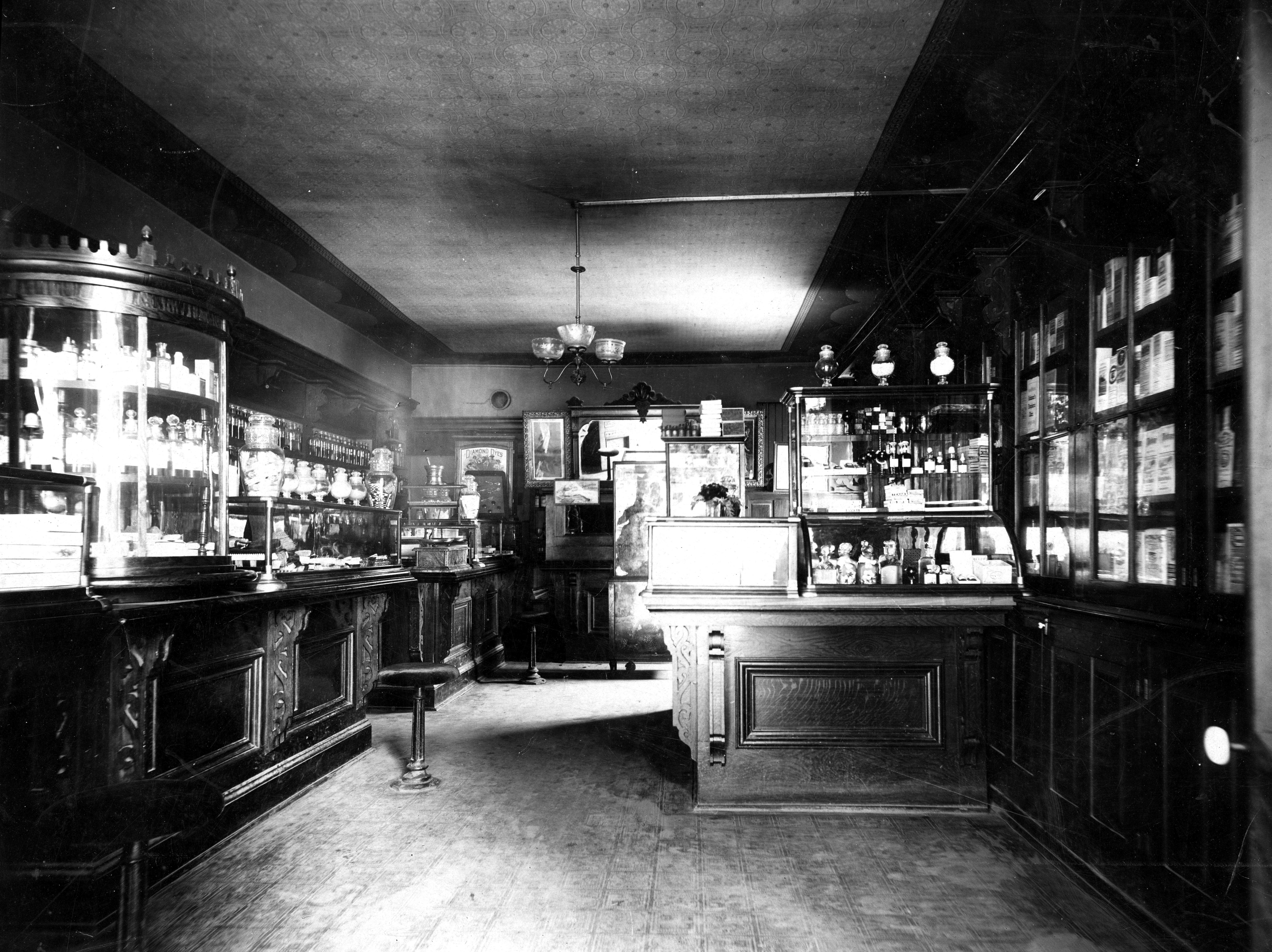 Interior of Haynie's Drugs at 1022 SE 2nd St., formerly 1144 Upper 2nd St., at the corner with Parrett St. [George Washington] Haynie (1857-1939) was a well-known and respected business owner, public servant, and family man.... In addition to running his drug store from the late 1800s to 1928, he served as the commissioner of police, a board member of water works and safety, and president of the Indiana Druggist Association. President Grover Cleveland even appointed Haynie as surveyor of customs for the city. The local leader also was dubbed with the unique nickname, Mayor of Goosetown, in reference to the neighborhood's large population of geese. Haynie's drug store was situated on the first floor of a Second Street building designed by Weiss & Harris Architects, with his family home on the second floor above, where he lived with his wife Emma and their son Gilmore. Neighbors became Haynie's longtime customers, calling him by name, and vice versa. But after his retirement in 1928, he sold the business to fellow Evansville druggist H.A. Woods, and the store was destroyed twice: once by the Ohio River Valley Flood in 1937 and then by a fire in 1944. (http://www.evansvilleliving.com/articles/the-name-behind-the-corner) He is the great-grandfather to the originator of this collection.