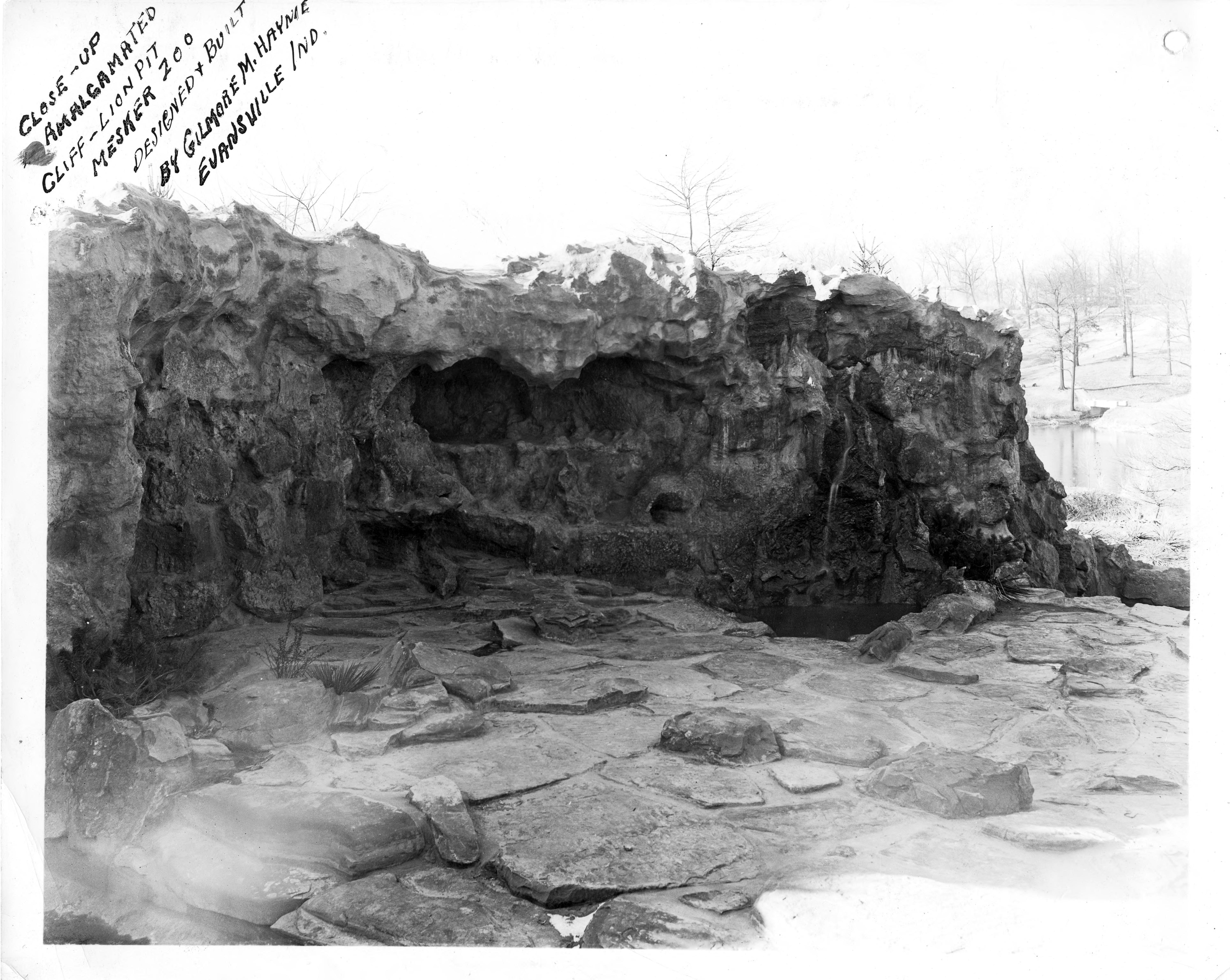 Close up amalgamated cliff-lion pit Mesker Zoo designed & built by Gilmore M. Haynie Evansville, Indiana. In 1916, Mesker Park was no more than a cluttered and undeveloped picnic area. Thanks to a $25,000 cash gift George Mesker gave to the city to purchase more land around the park, the dilapidated 50-acres became the site to one of the finest zoos in the country. Gilmore M. Haynie, visionary and proponent of the Park's transformation, became the executive secretary of the city park board in 1916, and later the board's president. Once Mesker's donation was realized, both Haynie and Mayor Benjamin Bosse created a plan to change the face of Mesker Park. The next 15 years saw weeds pulled, paths built, lights added, areas cleared, and a fine menagerie of random critters added to the planned zoo, featuring a goat, three rabbits, one raccoon, and six chickens. Belle and Brutus, the main attractions, were gifted lions from the American Circus Association, followed by a black bear from the Denver Zoo. On June 14, 1929, the park acquired its biggest creature when Kay, an 11,000-pound elephant, joined the team. Haynie utilized Works Progress Administration labor and efficient building strategies to do with $250,000 dollars what $2 million projected dollars would have done. He oversaw the design and construction of one the first barless bear exhibits in the country, followed by the unique, one-third concrete scale model of Christopher Columbus' Santa Maria, crewed by 20 rhesus monkeys. Haynie, whose wife Mildred founded Haynie Travel in 1938, was a world traveler who was inspired by zoos he visited in Germany for these ideas. Barless exhibits became the zoological standard for innovative and best practices largely due to the concepts he introduced in Evansville. In 1936, Mesker donated more funds to build the Mesker Amphitheatre that boasted seating room for 8,500. Mesker Park Zoo was rapidly becoming Evansville's number one attraction, receiving international renown for its ingenuity, creativity, and unique topographical use of space. During the zoo's initial design, Haynie contributed to another innovative barless den, this time for the lions, with spot-on botanical accuracy and an imitation African watering hole smack dab in the center of the zoo. It created a draw, says Amos Morris, current director of the zoo. The lions would stand on a pinnacle, and as you walk around the perimeter of the zoo you could almost always see them. (http://www.evansvilleliving.com/articles/its-a-zoo-out-there) Gilmore Haynie is the grandfather to the originator of this collection.