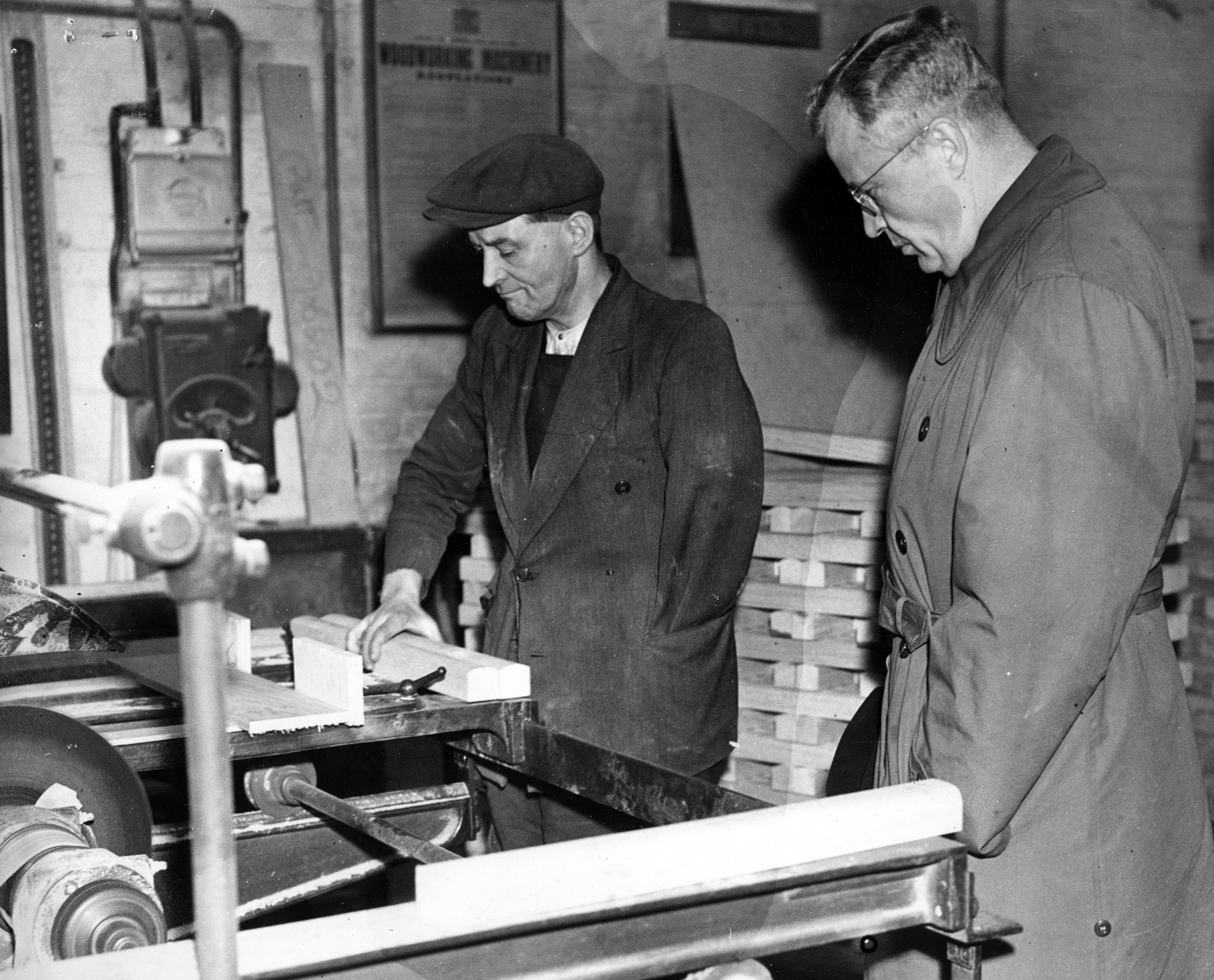 U.S. Congressman Charles LaFollette (right) talking to a man doing woodworking. It appears as though the man has lost his left arm.