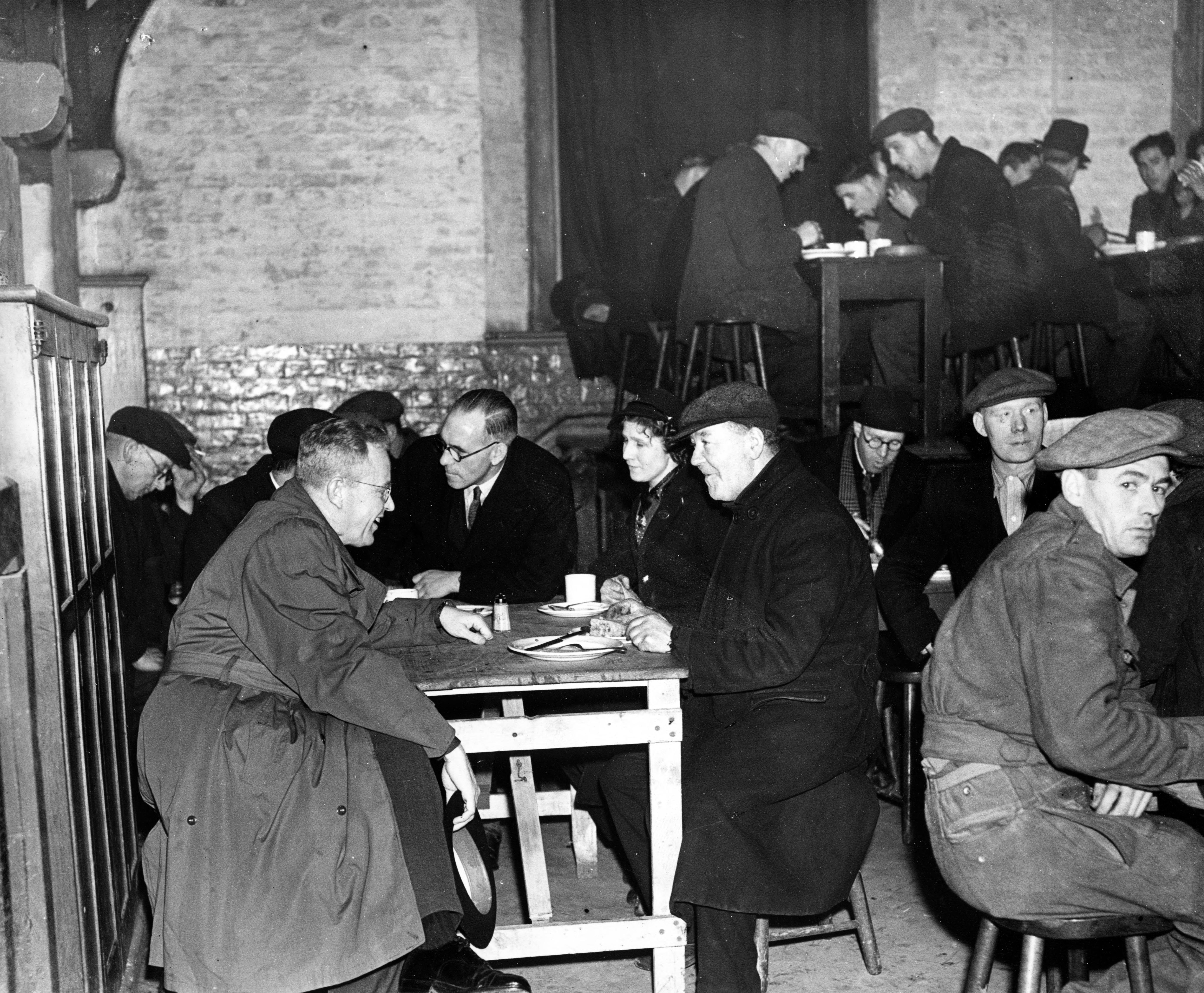 U.S. Congressman Charles LaFollette (left), sitting in what might be a restaurant, talking to people eating there. Charles M. LaFollette was member of the U.S. House of Representatives, from the state of Indiana, from 1943-1947. In 1947 he served as deputy chief of counsel for war crimes in the Nuremberg war trials.