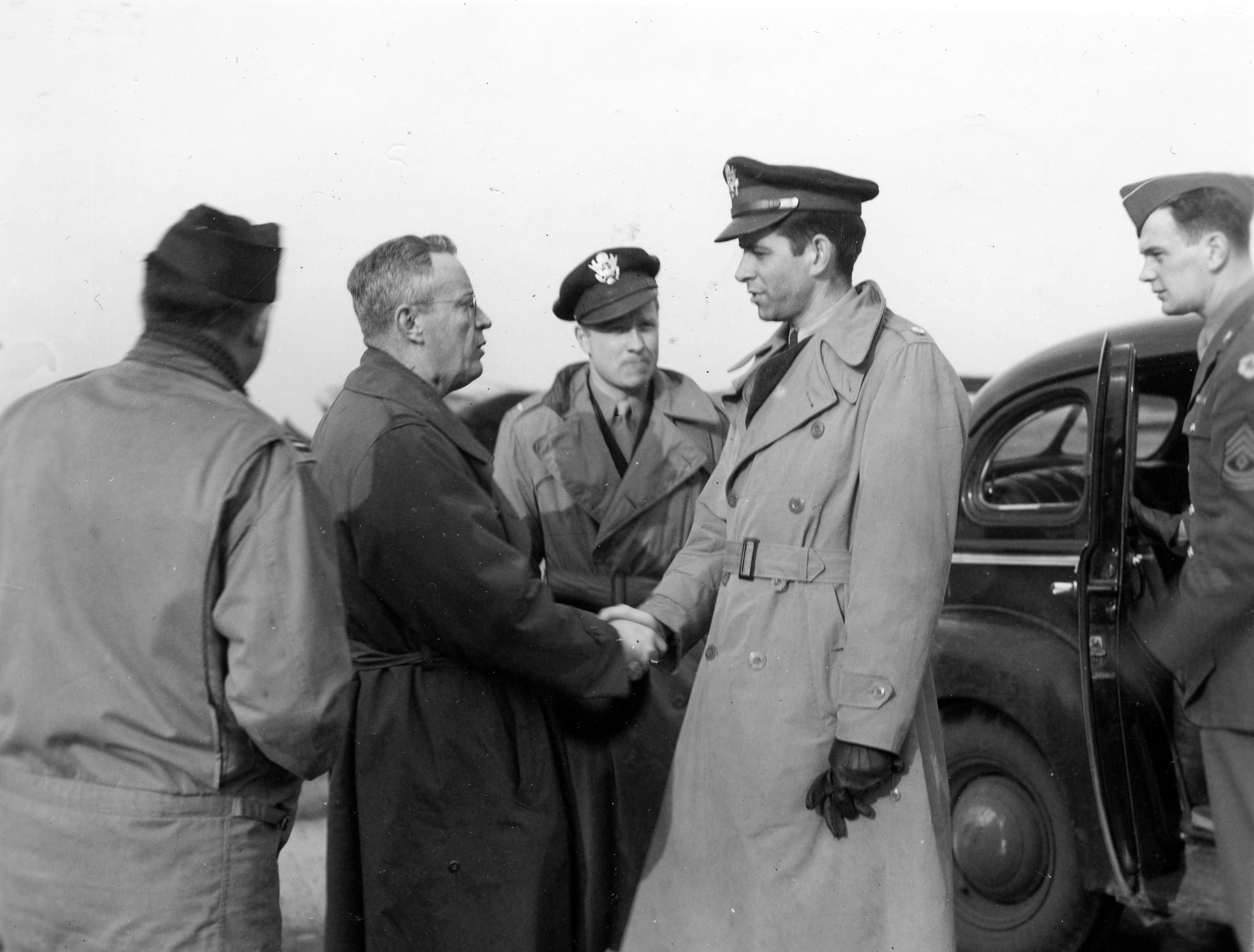 U.S. Congressman Charles LaFollette greeting Col. Seawall at 401st Bombardment Group at RAF Deenethorpe Base in Northampshire, England. RAF Deenethorpe is a former Royal Air Force station located 2 miles (3.2 km) east of Corby, Northamptonshire, England. Deenethorpe was constructed in 1943 and was allocated to the United States Army Air Forces Eighth Air Force. It was assigned USAAF designation Station 128. With the opening of the airfield in October 1943, the 401st Bombardment Group (Heavy), arrived from Great Falls AAB, Montana, in November. The 401st was assigned to the 94th Combat Bombardment Wing of the 1st Bombardment Division. Charles M. LaFollette was member of the U.S. House of Representatives, from the state of Indiana, from 1943-1947. In 1947 he served as deputy chief of counsel for war crimes in the Nuremberg war trials.
