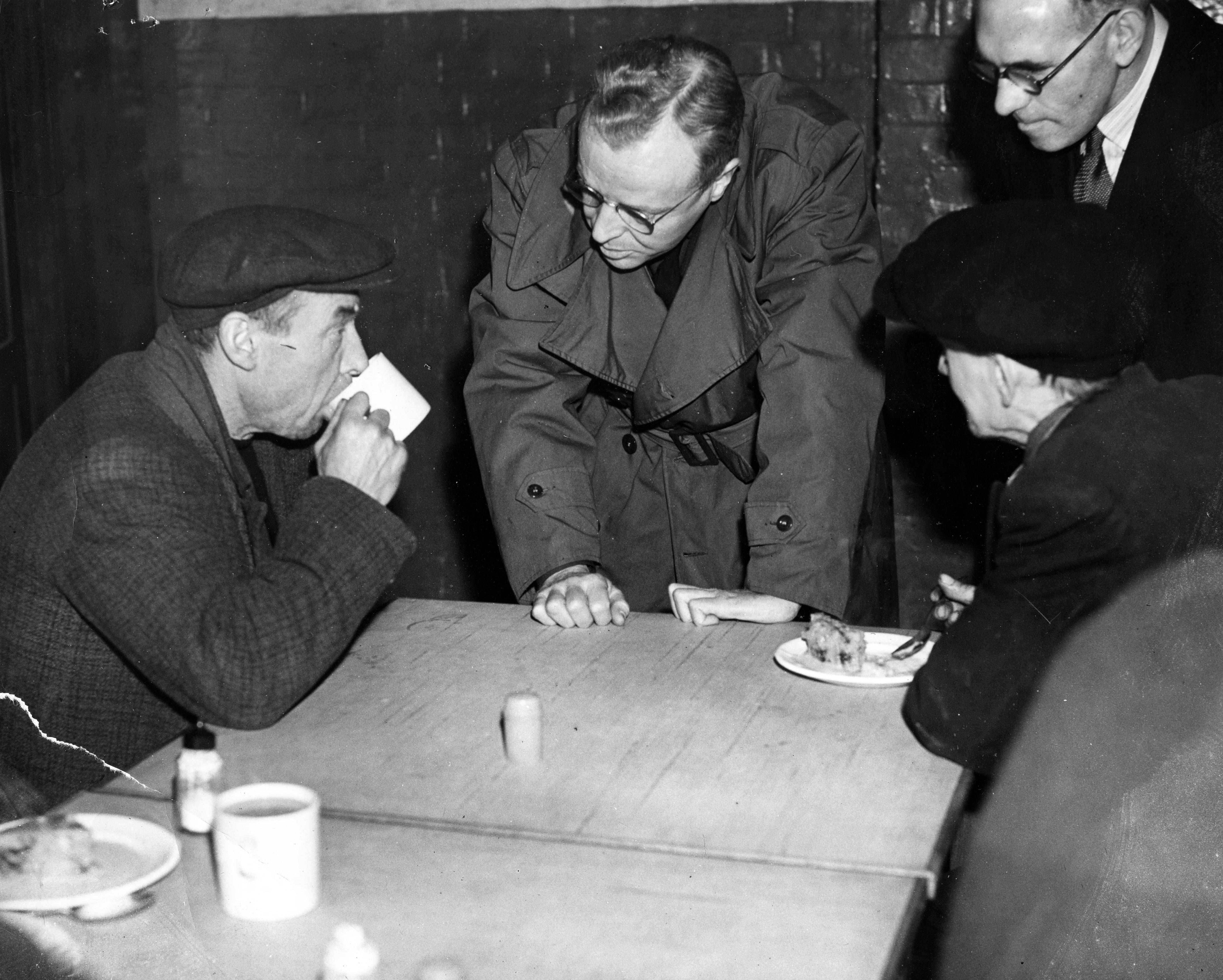 U.S. Congressman Charles LaFollette (center) and another man talk to two working men, eating their meals. Charles M. LaFollette was member of the U.S. House of Representatives, from the state of Indiana, from 1943-1947. In 1947 he served as deputy chief of counsel for war crimes in the Nuremberg war trials.