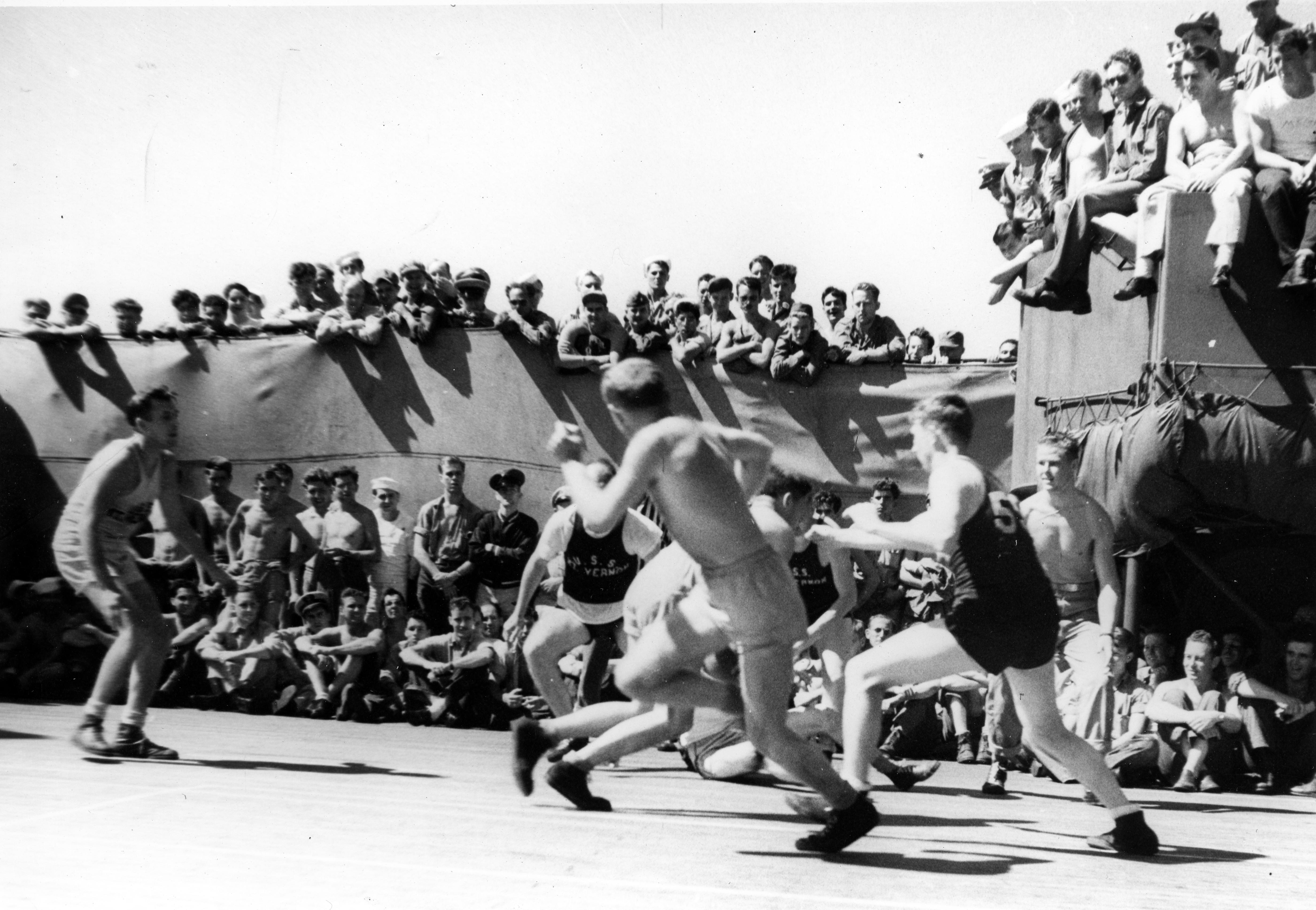 Basketball game on USS Mt. Vernon. USS Mount Vernon (AP-22) was a troop transport that served with the United States Navy during World War II. Prior to her military service, she was a luxury ocean liner named SS Washington.