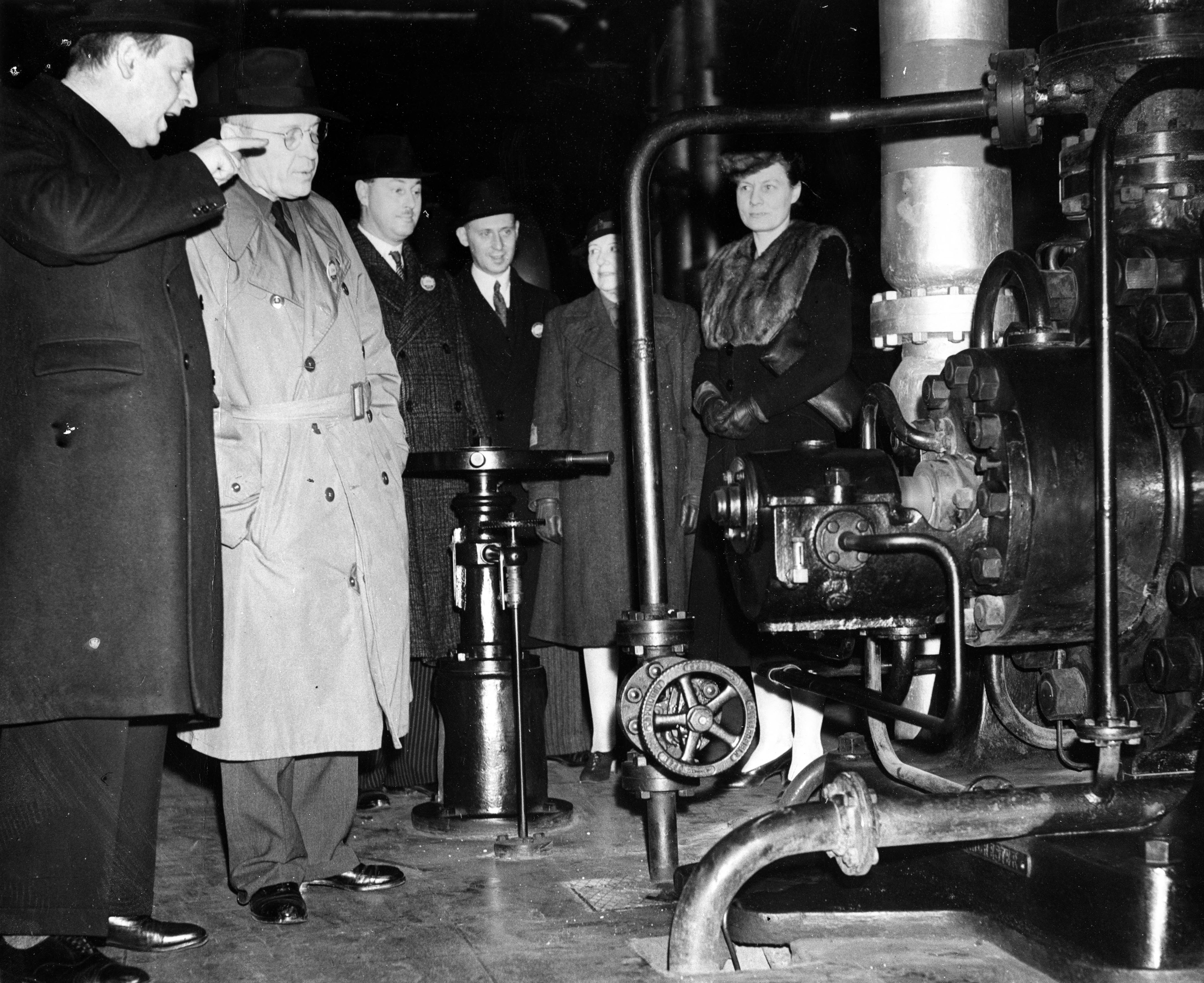 Unidentified, U.S. Congressman Charles LaFollette, unidentified, mayor of Fulham West, unidentified, and Dr. Edith Summerskill, looking at some sort of machinery in Fulham West, London, England. A listing of the mayors of Fulham identifies the mayor as either Stanislaus Seuffert (1944-45) or John William Perotti (1945-46). Edith Clara Summerskill, Baroness Summerskill, was a British physician, feminist, Labour politician and writer. Charles M. LaFollette was member of the U.S. House of Representatives, from the state of Indiana, from 1943-1947. In 1947 he served as deputy chief of counsel for war crimes in the Nuremberg war trials.
