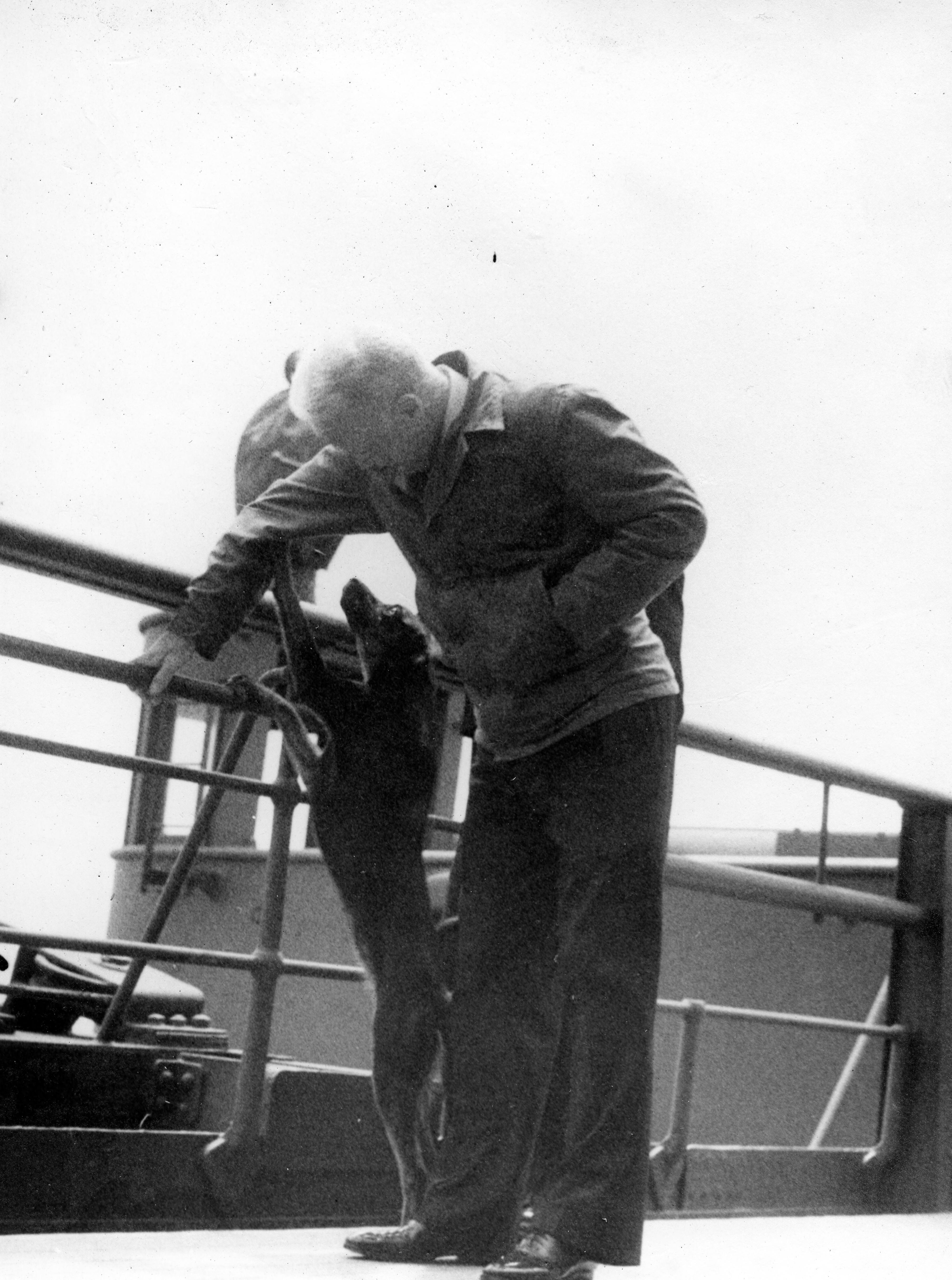 U.S. Congressman Charles LaFollette and dog aboard the USS Mt. Vernon. Charles M. LaFollette was member of the U.S. House of Representatives, from the state of Indiana, from 1943-1947. In 1947 he served as deputy chief of counsel for war crimes in the Nuremberg war trials.