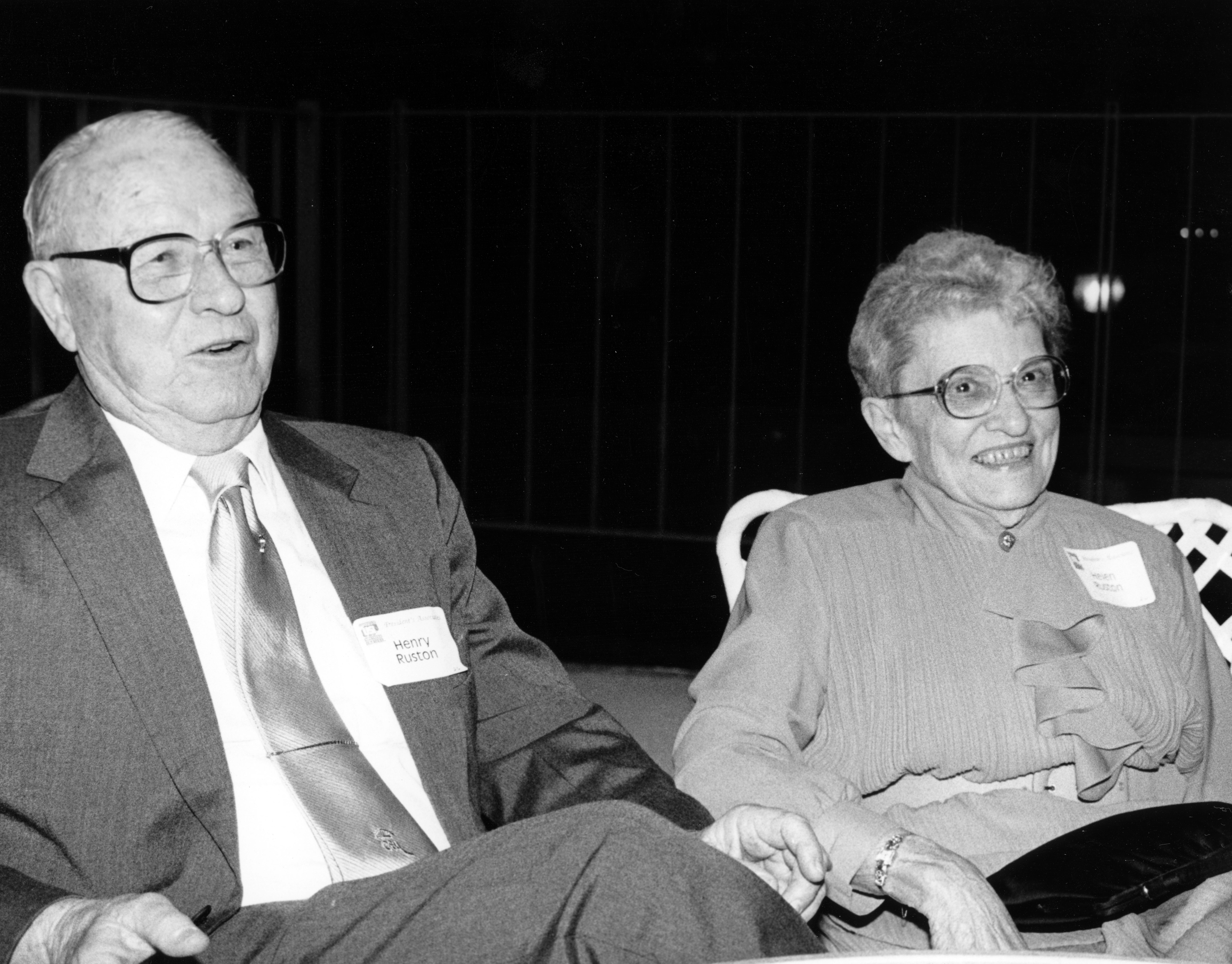 Henry and Helen Ruston sitting together at a USI event. Henry Ruston was born in Evansville, IN on August 25, 1921, and was a graduate of Bosse High School, University of Evansville, and University of Miami. He served as a flight instructor in the United States Air Force during World War II. After the war, he was a florist until his retirement. Ruston was married to Helen (nee Niednagel) until her death in 1997, and to his second wife, Betty Jane Taylor Hopkins, until her death in 2002. He did not have any children. In 1995, he and his wife, Helen, received honorary degrees from the University of Southern Indiana. Ruston passed away on December 1, 2005. This photograph is related to the honorary degrees.