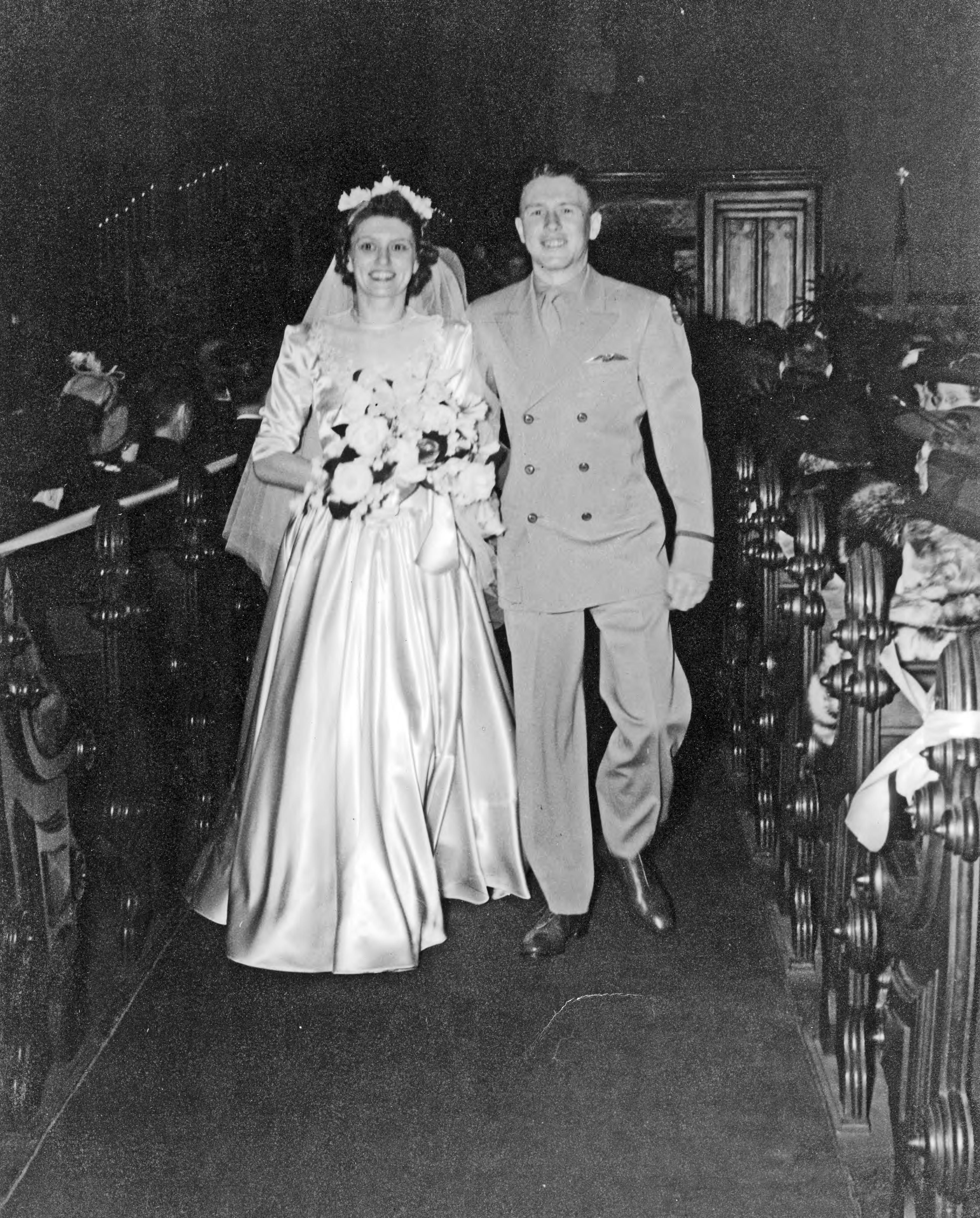 Henry and Helen Ruston walking down the aisle in Evansville, Indiana