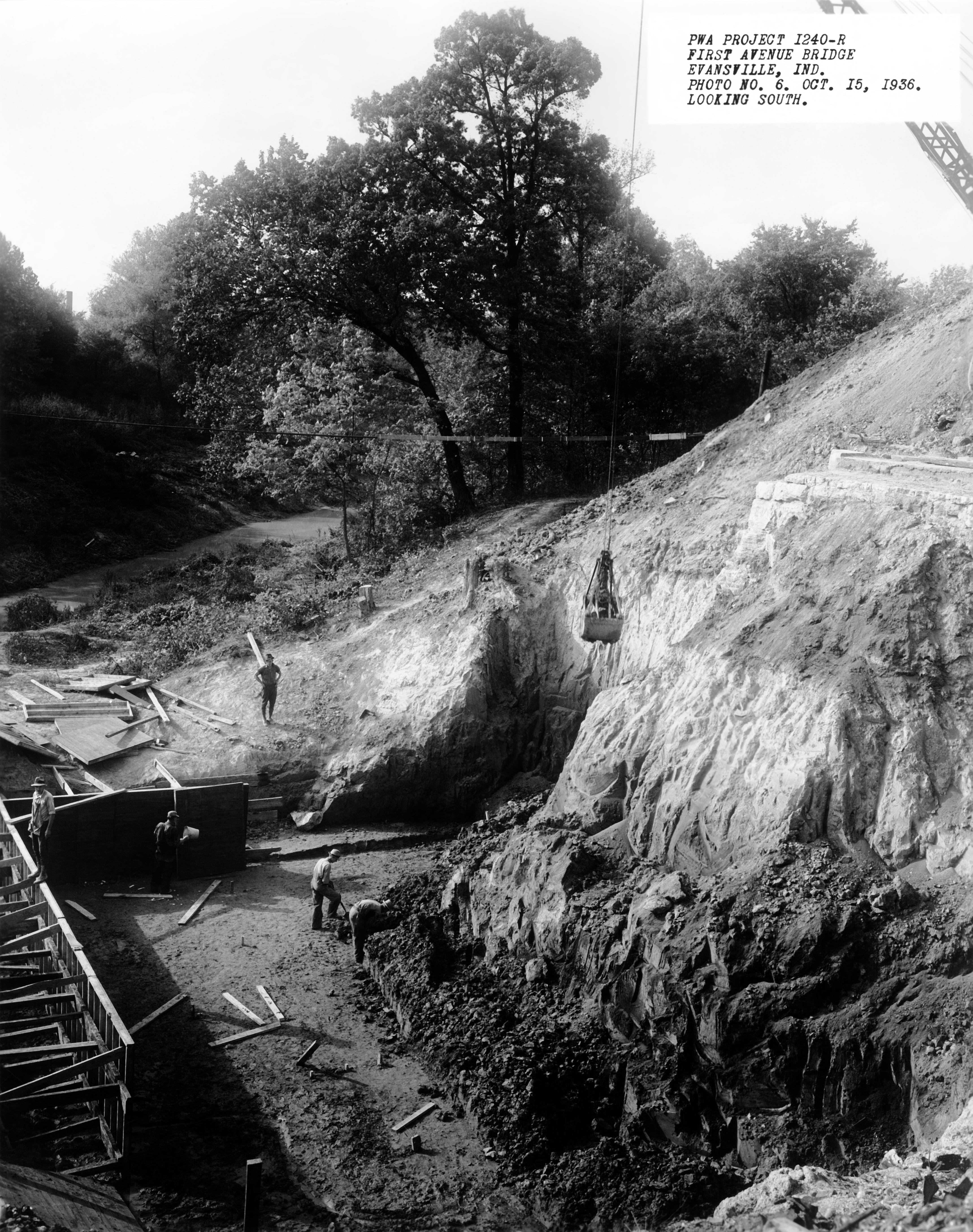 PWA Project I240-R--First Ave. bridge, photo #6 for October 15, 1936, looking south, with excavation underway for the new bridge and some structure in place. The Public Works Administration (PWA) was a New Deal program designed to alleviate the Great Depression. It built large-scale public works such as dams, bridges, hospitals, and schools. Its goals were to spend $3.3 billion in the first year, and $6 billion in all, to provide employment, stabilize purchasing power, and help revive the economy. Most of the spending came in two waves in 1933-35, and again in 1938. Originally called the Federal Emergency Administration of Public Works, it was renamed the Public Works Administration in 1935 and shut down in 1944.