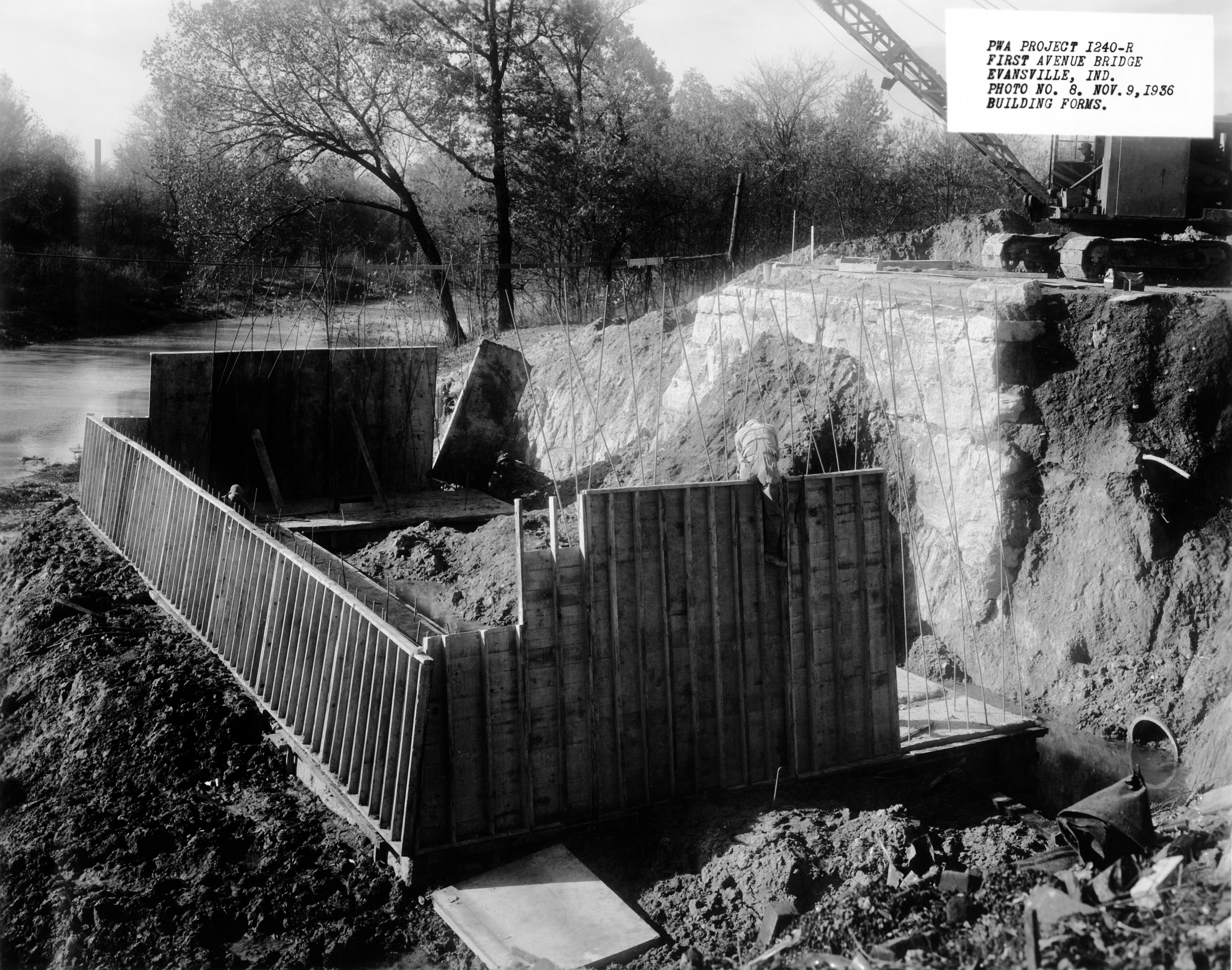 PWA Project I240-R--First Ave. bridge, photo #8 for November 9, 1936, building forms for the new bridge. The Public Works Administration (PWA) was a New Deal program designed to alleviate the Great Depression. It built large-scale public works such as dams, bridges, hospitals, and schools. Its goals were to spend $3.3 billion in the first year, and $6 billion in all, to provide employment, stabilize purchasing power, and help revive the economy. Most of the spending came in two waves in 1933-35, and again in 1938. Originally called the Federal Emergency Administration of Public Works, it was renamed the Public Works Administration in 1935 and shut down in 1944.