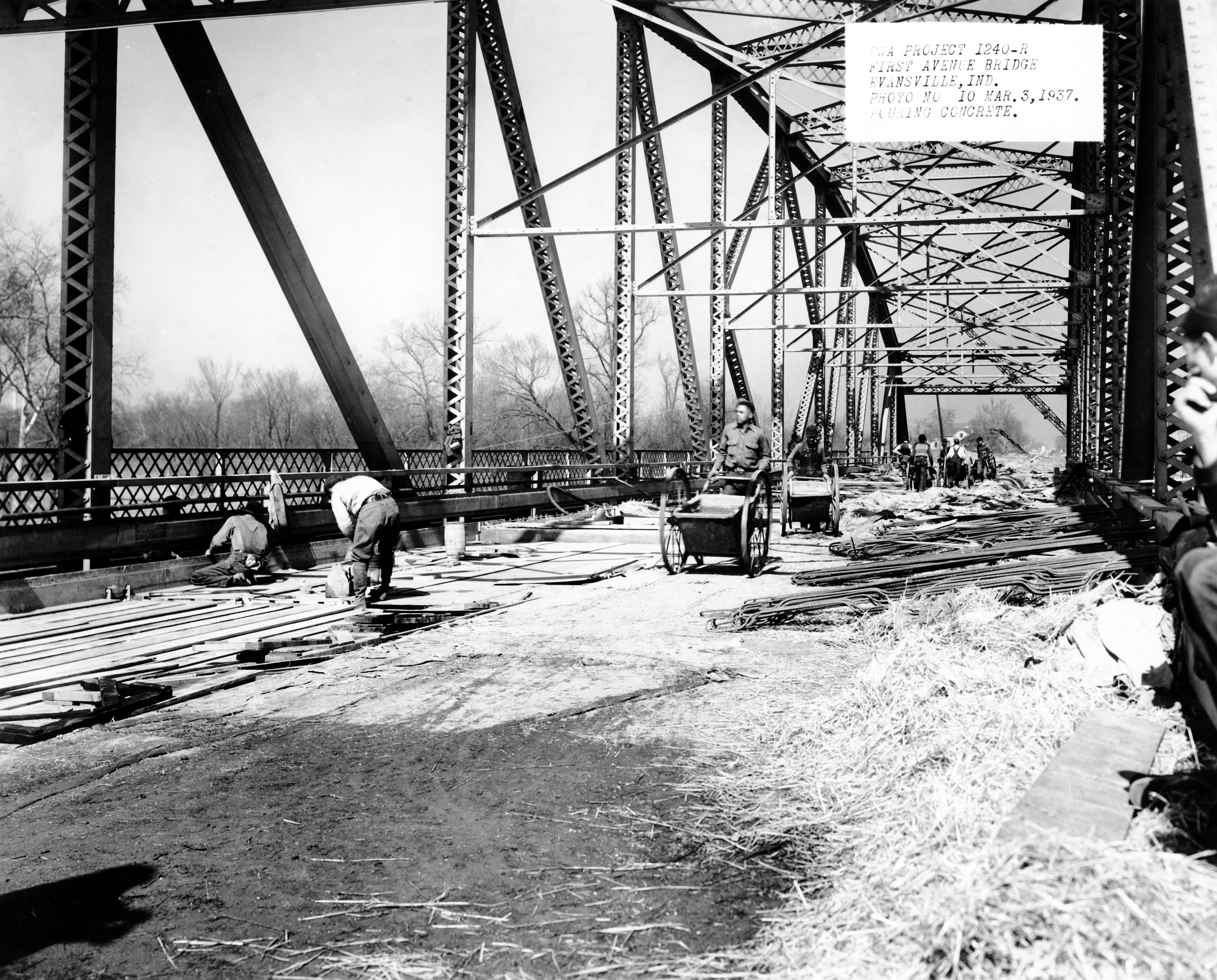 PWA Project I240-R--First Ave. bridge, photo #10 for March 3, 1937, pouring concrete for the new bridge. The Public Works Administration (PWA) was a New Deal program designed to alleviate the Great Depression. It built large-scale public works such as dams, bridges, hospitals, and schools. Its goals were to spend $3.3 billion in the first year, and $6 billion in all, to provide employment, stabilize purchasing power, and help revive the economy. Most of the spending came in two waves in 1933-35, and again in 1938. Originally called the Federal Emergency Administration of Public Works, it was renamed the Public Works Administration in 1935 and shut down in 1944.