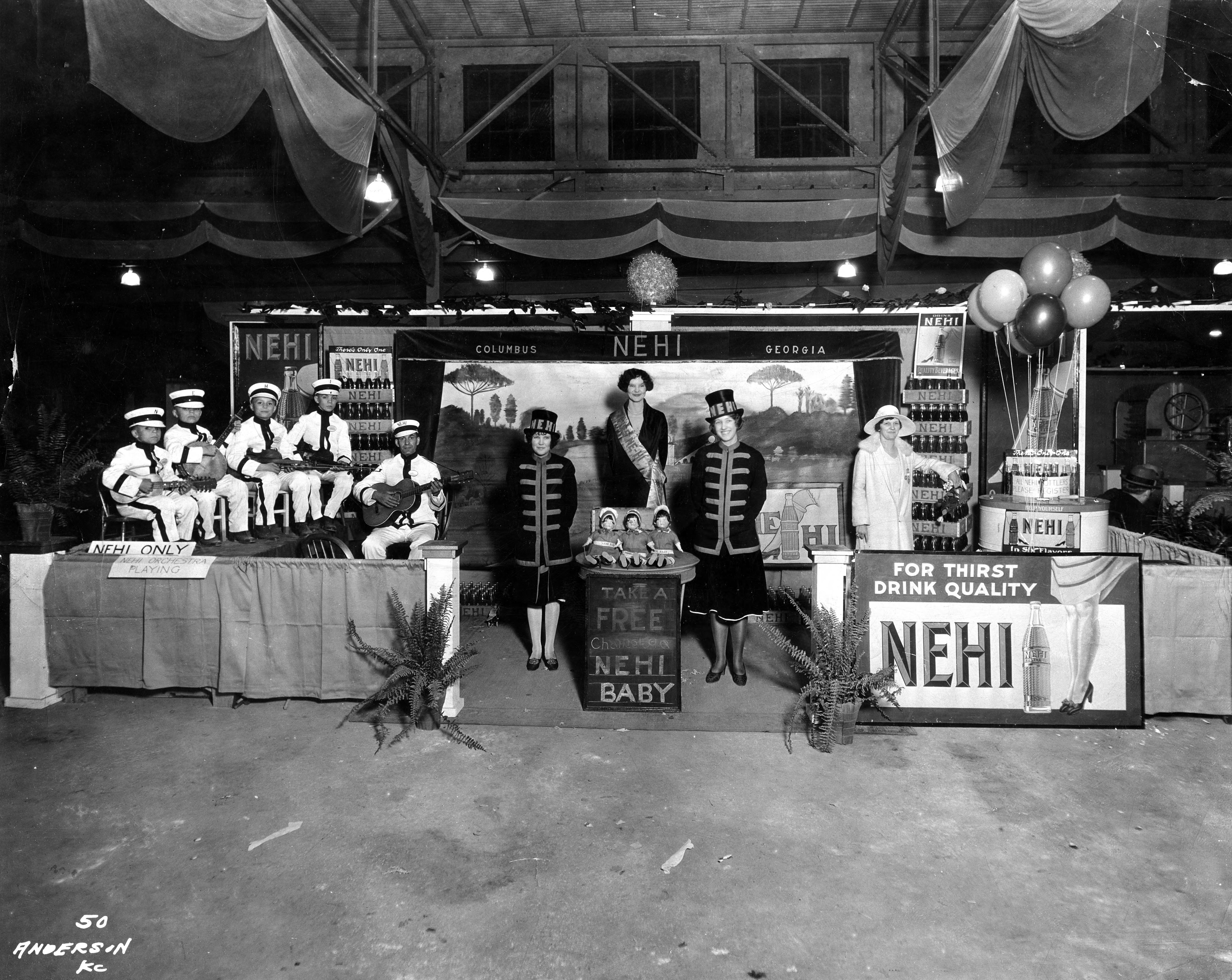 Booth advertising Nehi soda, originally made in Columbus, GA. Four women wear Nehi hats or a sash. There is a drawing for a free Nehi baby doll. Four young boys and a man sit off to one side as the Nehi orchestra with guitars, violins, and a banjo. Nehi is a flavored soft drink that originated in the United States. It was introduced in 1924 by Chero-Cola/Union Bottle Works. The Nehi Corporation name was adopted in 1928 after the Nehi fruit-flavored sodas became popular. In 1955, the company changed its name to Royal Crown Company, after the success of its RC Cola brand. It was founded by Claud A. Hatcher, a Columbus, Georgia grocer, who began bottling ginger ale and root beer in 1905. In April 2008, Nehi became a brand of Dr Pepper Snapple Group in the United States.