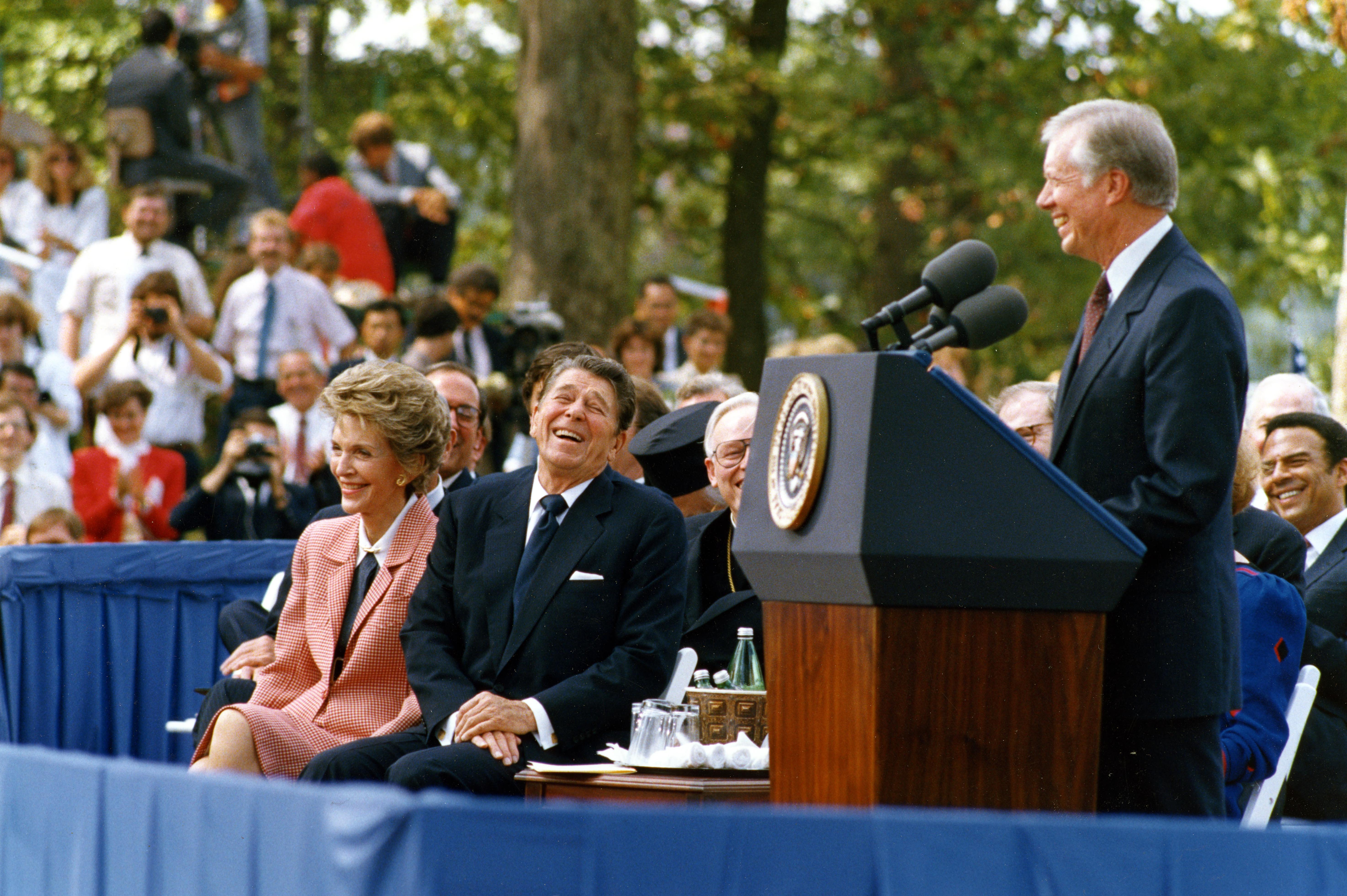 President Jimmy Carter speaking at the dedication ceremony for the Jimmy Carter Presidential Library. Jimmy and Rosalynn Carter sit immediately to his right, with Nancy Reagan at the end of the row. The Jimmy Carter Presidential Library & Museum is located at 441 Freedom Parkway in Atlanta, GA. The African American man seen behind Carter is Andrew Young, a U.S. Congressman from GA and U.S. ambassador to the United Nations during the Carter administration.